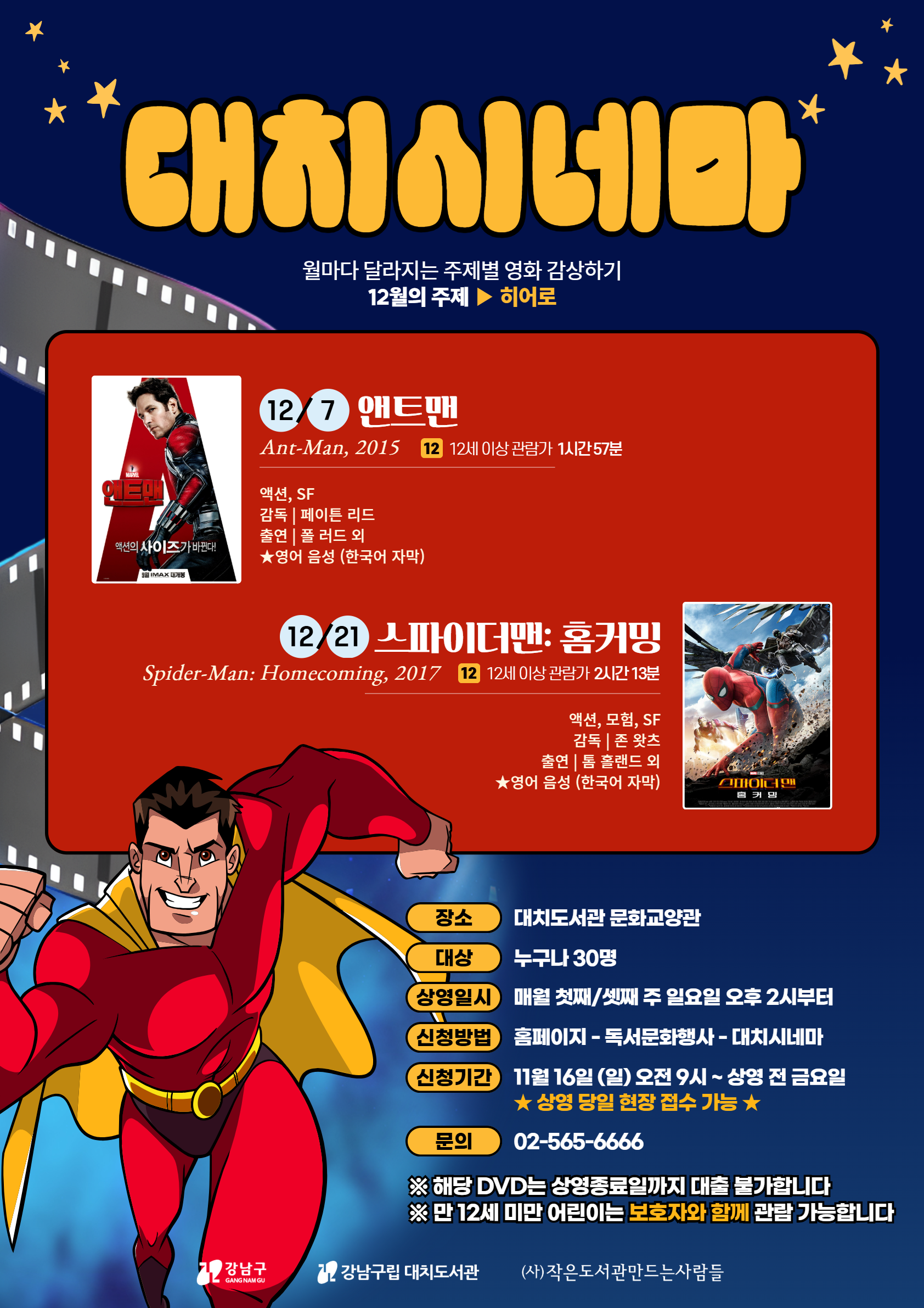 월마다 달라지는 주제별 영화를 감상하는 시간! 12월 첫째, 셋째 주 일요일 오후 2시에 "대치도서관 문화교양관"에서 만나보실 수 있습니다 :) 12월의 주제는 "히어로"입니다. 만화에서 튀어나온 영웅들의 모험을 대치도서관에서 즐겨보세요! 일시 : 12/7, 12/21 (일) 오후 2시~4시 장소 : 대치도서관 문화교양관 대상 : 도서관 이용자 누구나 ※ 만 12세 미만 어린이의 경우 보호자와 함께 관람 가능합니다. 신청 방법 : 홈페이지 독서문화행사>대치시네마>2025년 12월>신청하기 신청 시간 : 11/16 (일) 오전 9시 ~ 상영 전 금요일 오후 2시 ★상영 당일 현장 접수 가능합니다★ 신청 바로가기