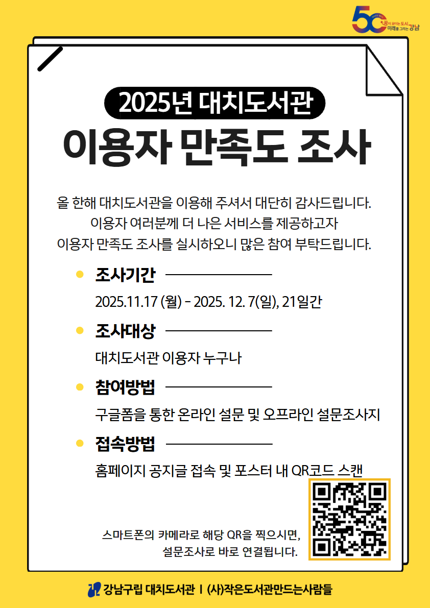 대치도서관에서는 도서관 이용자를 대상으로 이용 만족도에 대한 조사를 진행하고 있습니다.