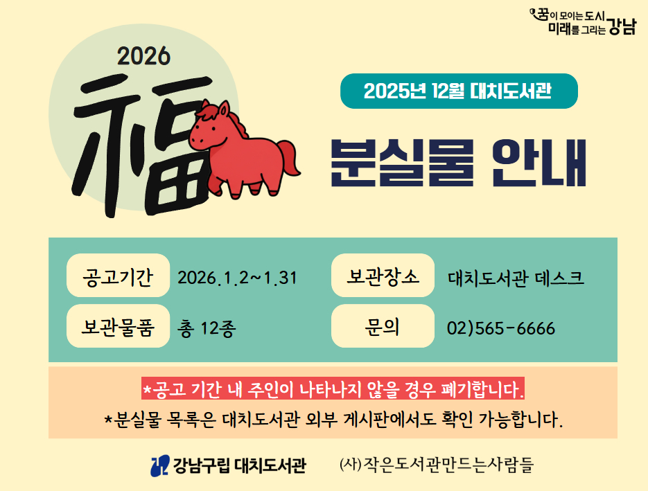 [대치도서관 분실물 안내] 2025년 12월에 발생한 분실물을 안내합니다. 안내한 분실물은 보관기간 이후 2026년 2월1일에 폐기 예정이오니, 기간내에 찾아가시기를 바랍니다. 분실물은 데스크에서 보관중이며 분실물 목록은 대치도서관 외부 게시판에서도 확인 가능합니다. ▶ 대치도서관 자료실 운영시간 - 평일 : 오전9시 - 오후9시 - 주말 : 오전9시 - 오후6시 ※ 휴관 : 매주 화요일 / 법정공휴일 ![]() ![]()