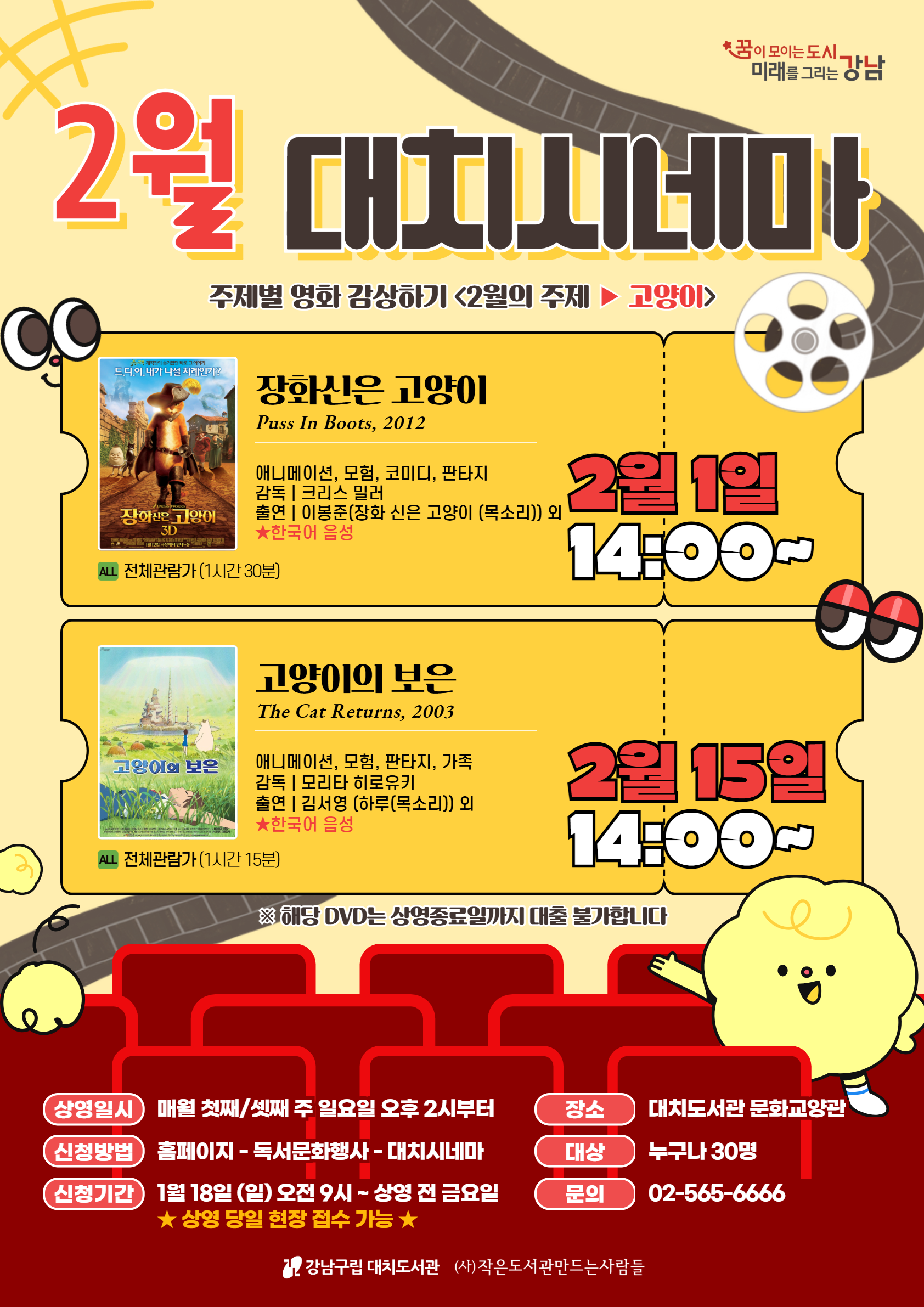 월마다 달라지는 주제별 영화를 감상하는 시간! 2월 첫째, 셋째 주 일요일 오후 2시에 "대치도서관 문화교양관"에서 만나보실 수 있습니다 :) 2월의 주제는 "고양이"입니다.😽 대치시네마와 함께 귀여운 고양이 친구들의 모험을 따라가보세요! 일시 : 2/1, 2/15 (일) 오후 2시~4시 장소 : 대치도서관 문화교양관 대상 : 도서관 이용자 누구나 신청 방법 : 홈페이지 독서문화행사>대치시네마>2026년 2월>신청하기 신청 시간 : 1/18(일) 오전 9시 ~ 상영 전 금요일 오후 2시 ★상영 당일 현장 접수 가능합니다★ 신청 바로가기