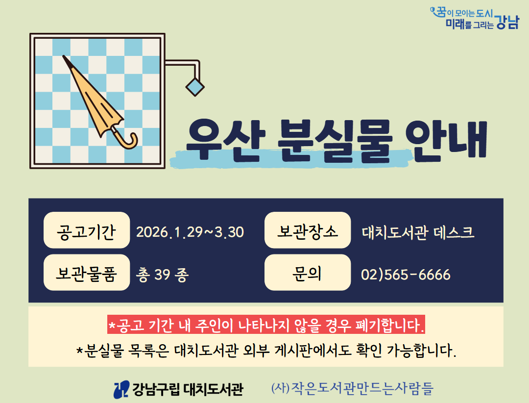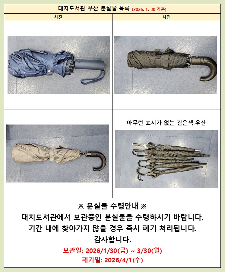 [대치도서관 ★우산 분실물★ 안내] ※보관 기간을 3월 30(월) 까지 연장 합니다. 봄비가 내리기 전에 찾아가시기를 바랍니다. 대치도서관에서 보관중인 우산 분실물을 안내합니다. 안내한 우산 분실물은 보관기간 이후 2026년 분실물은 데스크에서 보관중이며 분실물 목록은 대치도서관 외부 게시판에서도 확인 가능합니다. ▶ 대치도서관 자료실 운영시간 - 평일 : 오전9시 - 오후9시 - 주말 : 오전9시 - 오후6시 ※ 휴관 : 매주 화요일 / 법정공휴일 ![]() ![]() ![]() ![]() ![]() |