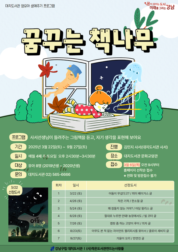 꿈꾸는 책나무 - 홈페이지 접수만 가능 (전화 및 방문접수 불가) 1. 일시 : 2025년 03월 22일(토)~2025년 9월 27일(토), 매월 넷째주 토요일 오후 2시 30분 ~ 3시 30분 [총 7회] 2. 장소 : 대치도서관 문화교양관 3. 대상 : 유아(2019년생~2020년생) 8명 4. 접수 : 2025년 3월 6일(목) 오전 9시부터 홈페이지 선착순 접수 5. 진행 : 김민지 (대치도서관 사서) 6. 참가비 : 무료 7. 문의 : 대치도서관 02-565-6666 ※ 프로그램 신청 시, 해당 연령 확인 후 참여자의 아이디로 신청바랍니다. |