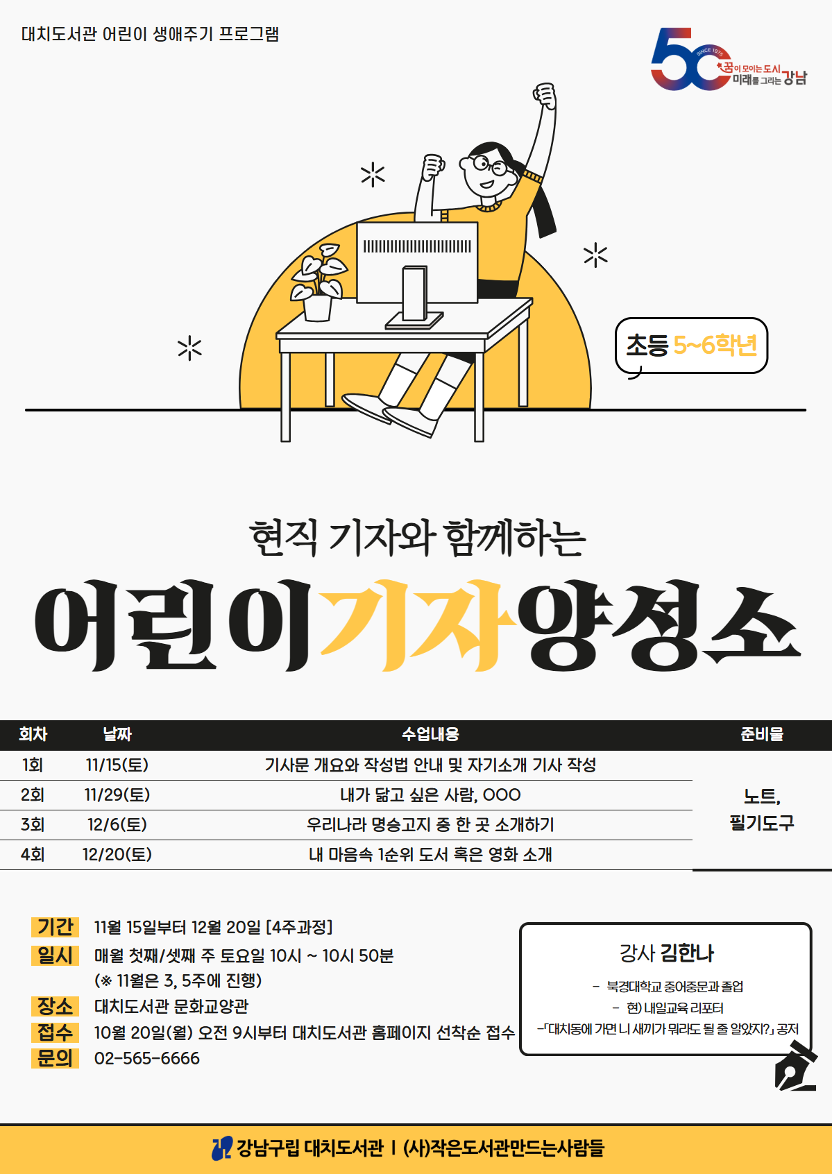 11월 수업은 강사님 일정으로 11/15(토), 11/29(토) 3, 5주로 변경되었습니다. ================================================================== (현직 기자와 함께하는)어린이 기자 양성소(5~6학년)(11~12월) - 홈페이지 접수만 가능 (전화 및 방문접수 불가) ※ 첫 수업은 기사문 전반에 대한 개요를 짚는 시간입니다. 빠짐없이 참석 부탁드립니다. ※ 매 수업마다 정해진 주제로 기사문을 작성하는 수업입니다. 수업 전 작성할 기사 주제는 미리 자료조사를 해온 뒤 수업에 참여해 주세요. 1. 일 시 : 2025년 11월 15일(토)~2025년 12월 20일(토), 매월 1,3주 토요일 오전 10시~10시 50분 (* 11월은 3, 5주에 진행) 2. 장 소 : 대치도서관 문화교양관 3. 대 상 : 초등 5~6학년 10명 4. 준비물 : 노트, 필기도구 5. 진 행 : 김 한 나 6. 참가비 : 무료 7. 문의 : 대치도서관 02) 565-6666 8. 접수일정: 2025년 10월 20일(월) 오전 9시 ~ 2025년 10월 29일(수) 오후 6시 9. 접수안내: 프로그램 신청시, 해당 연령 확인 후 참여자의 아이디로 신청바랍니다. ※ 무단 결석 시, 추후 프로그램 참여가 제한될 수 있습니다. ※ 프로그램 일정 및 세부내용은 도서관 사정에 따라 변경될 수 있습니다. ![]()