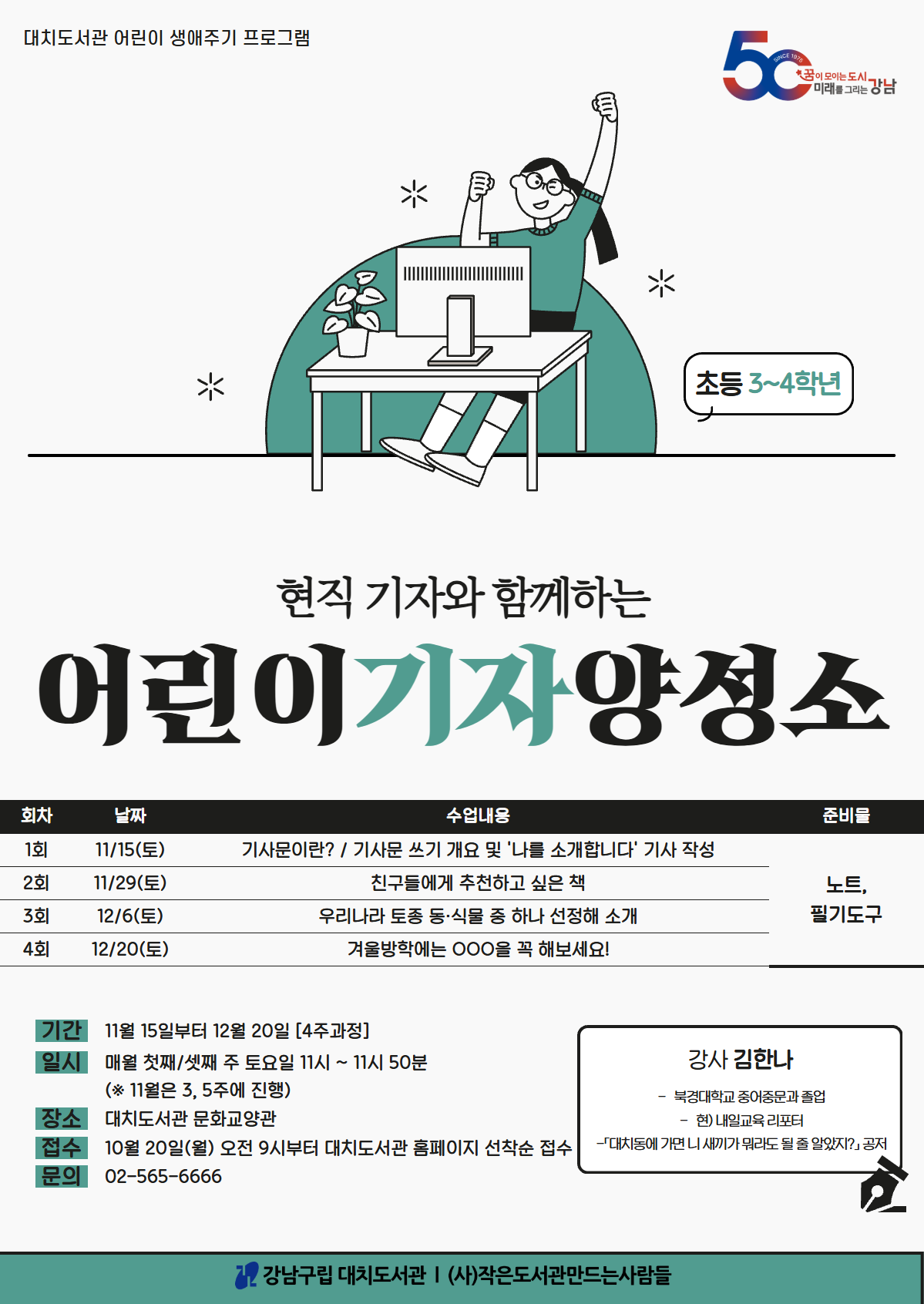 11월 수업은 강사님 일정으로 11/15(토), 11/29(토) 3, 5주로 변경되었습니다. ================================================================== (현직 기자와 함께하는) 어린이 기자 양성소(3~4학년)(11~12월) - 홈페이지 접수만 가능 (전화 및 방문접수 불가) ※ 첫 수업은 기사문 전반에 대한 개요를 짚는 시간입니다. 빠짐없이 참석 부탁드립니다! ※ 매 수업마다 정해진 주제로 기사문을 작성하는 수업입니다. 수업 전 작성할 기사 주제는 미리 자료조사를 해온 뒤 수업에 참여해 주세요. 1. 일 시 : 2025년 11월 1일(토)~2025년 12월 20일(토), 매월 1,3주 토요일 오전 11시~11시 50분 (* 11월은 3, 5주에 진행) 2. 장 소 : 대치도서관 문화교양관 3. 대 상 : 초등 3~4학년 10명 4. 준비물 : 노트, 필기도구 5. 진 행 : 김 한 나 6. 참가비 : 무료 7. 문의 : 대치도서관 02) 565-6666 8. 접수일정: 2025년 10월 20일(수) 오전 9시 ~ 2025년 10월 29일(수) 오후 6시 9. 접수안내: 프로그램 신청시, 해당 연령 확인 후 참여자의 아이디로 신청바랍니다. ※ 무단 결석 시, 추후 프로그램 참여가 제한될 수 있습니다. ※ 프로그램 일정 및 세부내용은 도서관 사정에 따라 변경될 수 있습니다. ![]()