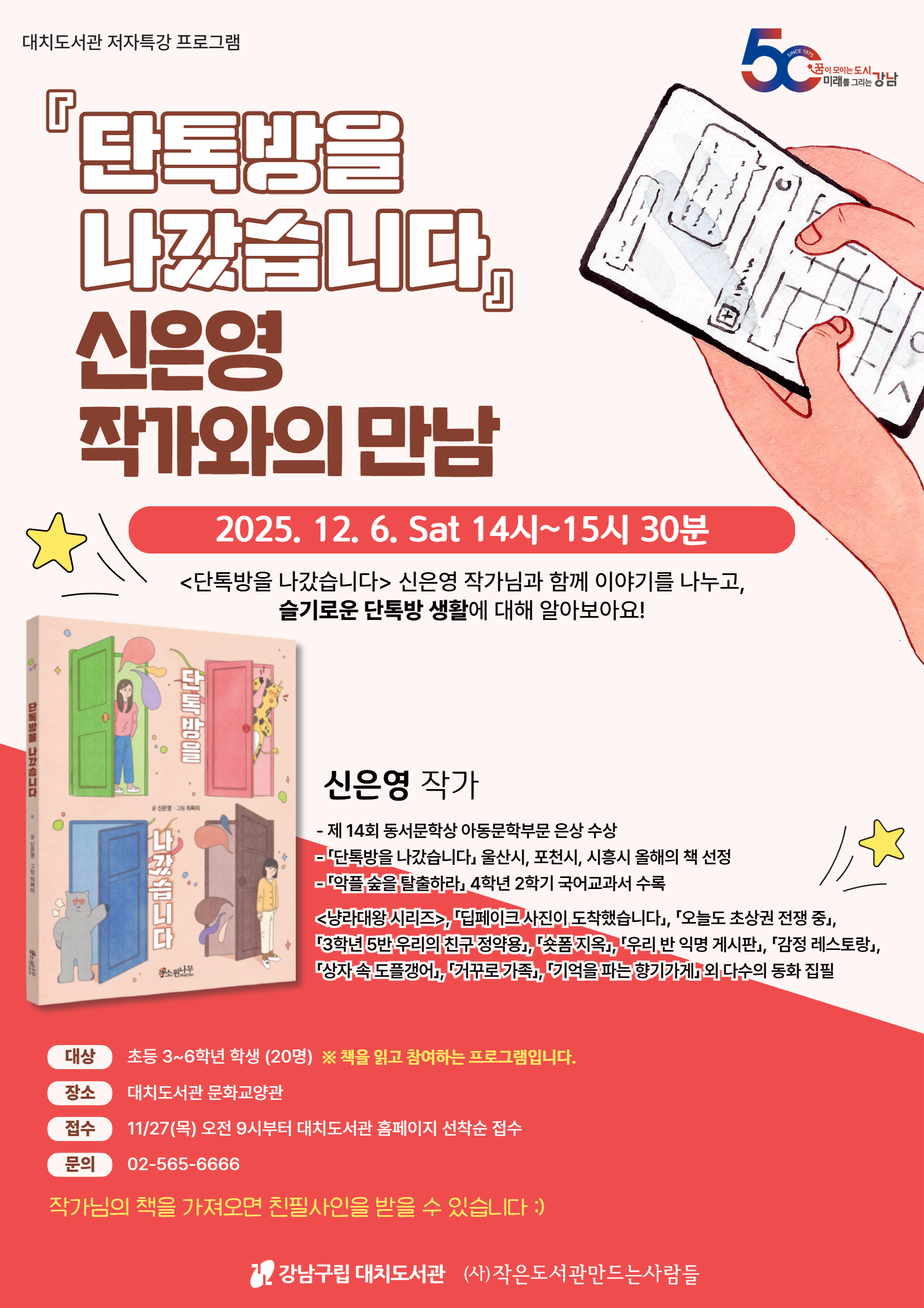『단톡방을 나갔습니다』 신은영 작가와의 만남 - 홈페이지 접수만 가능 (전화 및 방문접수 불가) 1. 일 시 : 2025년 12월 6일(토) 오후 2시~3시 30분 2. 장 소 : 대치도서관 문화교양관 3. 대 상 : 초등 3~6학년 (20명) 4. 진 행 : 신은영 (동화작가) 5. 신 청 : 2025년 11월 27일(목) 오전 9시부터 홈페이지 선착순 접수 6. 문 의 : 대치도서관 02-565-6666 작가와의 만남이 끝난 후 사인회가 진행될 예정입니다. 사인회 참여를 원하실 경우, 개인 소장 도서를 지참해 주세요! ※ 프로그램 신청 시, 해당 연령 확인 후 참여자 본인의 아이디로 신청바랍니다. ※ 프로그램 일정 및 세부내용은 도서관 사정에 따라 변경될 수 있습니다. ![]()