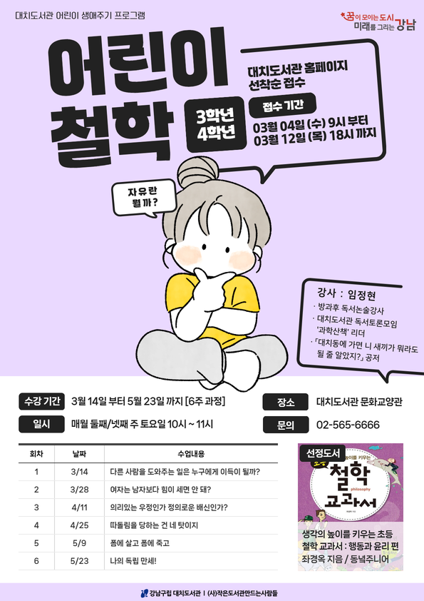 어린이 철학(3~4학년)(3~5월) - 홈페이지 접수만 가능 (전화 및 방문접수 불가) 1. 일 시 : 2026년 3월 14일(토)~2026년 5월 23일(토), 매월 2,4주 토요일 오전 10시 ~ 11시 2. 장 소 : 대치도서관 문화교양관 3. 대 상 : 초등 3~4학년 10명 4. 선정도서 : 『생각의 높이를 키우는 초등 철학 교과서 : 행동과 윤리 편』 (좌경옥 지음, 동녘주니어) 5. 진 행 : 임 정 현 6. 참가비 : 무료 7. 문의 : 대치도서관 02) 565-6666 8. 접수일정: 2026년 3월 4일(수) 오전 9시부터 홈페이지 선착순 접수 9. 접수안내: 프로그램 신청시, 해당 연령 확인 후 참여자의 아이디로 신청바랍니다. ※ 무단 결석 및 3회 이상 결석 시 해당 월 포함 3개월간 대치도서관 프로그램 신청이 제한됩니다. ※ 매 수업 시간에 반드시 책을 지참하여 참여해주시기 바랍니다. ※ 프로그램 일정 및 세부내용은 도서관 사정에 따라 변경될 수 있습니다. ![]()