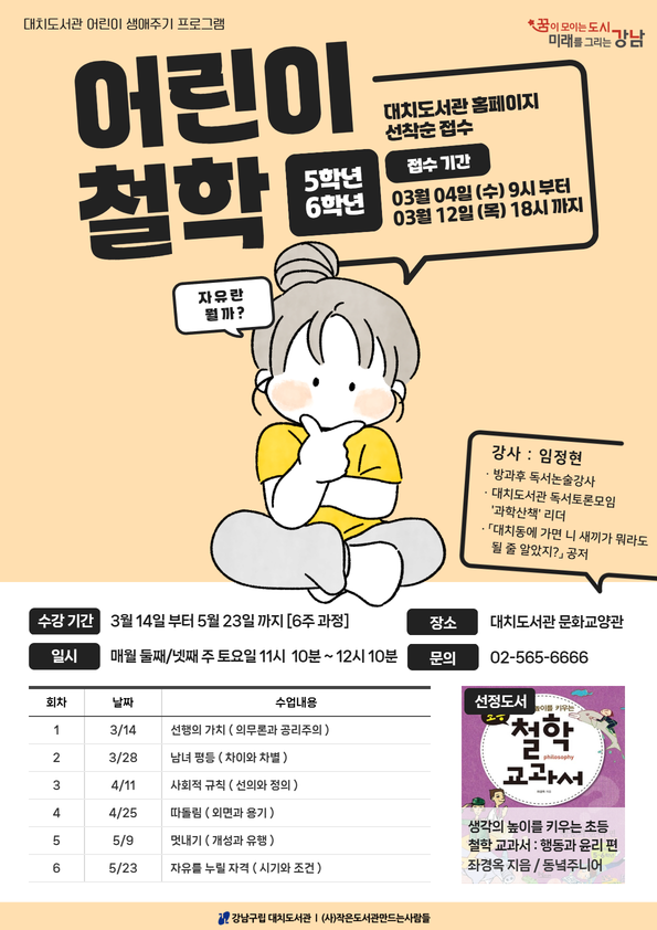 어린이 철학(5~6학년)(3~5월) - 홈페이지 접수만 가능 (전화 및 방문접수 불가) 1. 일 시 : 2026년 3월 14일(토)~2026년 5월 23일(토), 매월 2,4주 토요일 오전 11시 10분~ 12시 10분 2. 장 소 : 대치도서관 문화교양관 3. 대 상 : 초등 5~6학년 10명 4. 선정도서 : 『생각의 높이를 키우는 초등 철학 교과서 : 행동과 윤리 편』 (좌경옥 지음, 동녘주니어) 5. 진 행 : 임 정 현 6. 참가비 : 무료 7. 문의 : 대치도서관 02) 565-6666 8. 접수일정: 2026년 3월 4일(수) 오전 9시부터 홈페이지 선착순 접수 9. 접수안내: 프로그램 신청시, 해당 연령 확인 후 참여자의 아이디로 신청바랍니다. ※ 무단 결석 및 3회 이상 결석 시 해당 월 포함 3개월간 대치도서관 프로그램 신청이 제한됩니다. ※ 매 수업 시간에 반드시 책을 지참하여 참여해주시기 바랍니다. ※ 프로그램 일정 및 세부내용은 도서관 사정에 따라 변경될 수 있습니다. ![]()