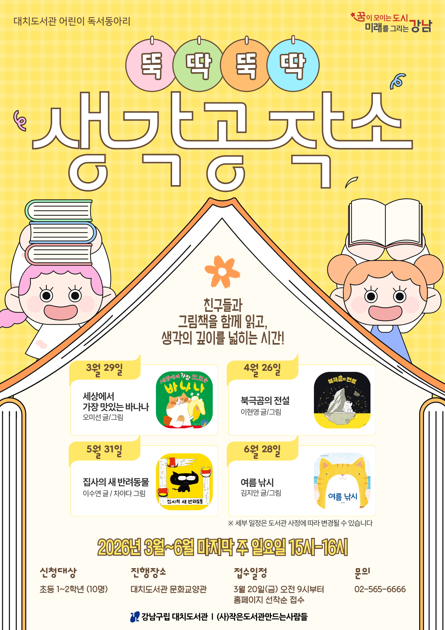 뚝딱뚝딱 생각공작소(3~6월) - 홈페이지 접수만 가능 (전화 및 방문접수 불가) 1. 기 간 : 2026년 3월 29일(일)~2026년 6월 28일(일) 2. 일 시 : 매월 마지막 주 일요일 오후 3시~4시 3. 대 상 : 초등 1~2학년 (10명) 4. 장 소 : 대치도서관 문화교양관 5. 참가비 : 무료 6. 신 청 : 2026년 3월 20일(금) 오전 9시부터 홈페이지 선착순 접수 7. 문 의 : 대치도서관 02)565-6666 ※ 무단 결석 및 2회 이상 결석 시 해당 월 포함 3개월간 대치도서관 프로그램 신청이 제한됩니다. ※ 프로그램 신청시, 해당 연령 확인 후 참여자 본인의 아이디로 신청바랍니다. ※ 프로그램 일정 및 세부내용은 도서관 사정에 따라 변경될 수 있습니다. ![]()