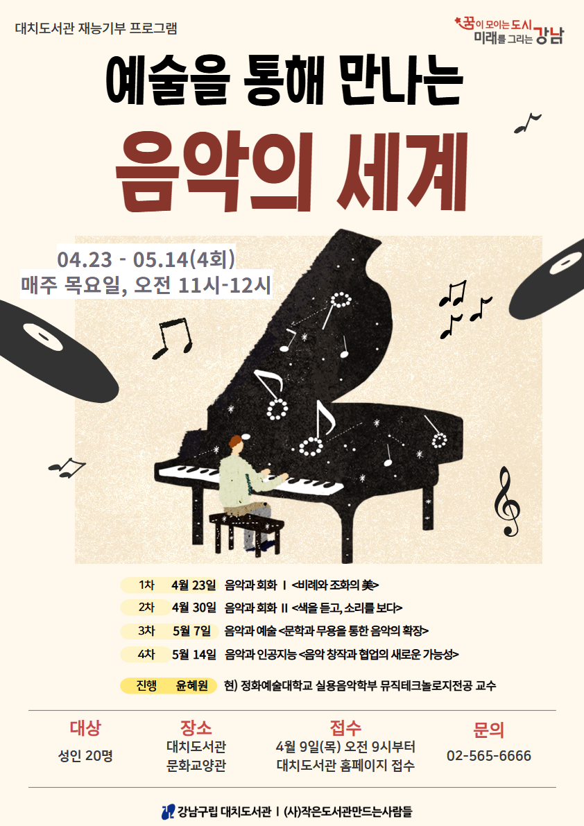 예술을 통해 만나는 음악의 세계 - 홈페이지 접수만 가능 (전화 및 방문접수 불가) 1. 일 시 : 2026년 4월 23일(목)~5월 14일(목), 매주 목요일 오전 11시~12시 2. 장 소 : 대치도서관 문화교양관 3. 대 상 : 성인 (20명) 4. 진 행 : 윤혜원 교수 · 서울대학교 음악대학 기악과(피아노전공) 졸업 · 서울대학교 음악대학 기악과(피아노전공) 석사 및 박사과정 졸업 · 현) 정화예술대학교 실용음악학부 뮤직테크놀로지전공 교수 5. 참가비 : 무료 6. 접수일정 : 2026년 4월 9일(목) 오전 9시부터 홈페이지 선착순 접수 7. 문의 : 대치도서관 02)565-6666 ※ 프로그램 일정 및 세부 내용은 도서관 사정에 따라 변경될 수 있습니다. ※ 프로그램 신청 시, 해당 연령 확인 후 참여자 본인의 아이디로 신청바랍니다. ※ 무단 결석 및 2회 이상 결석 시 해당 월 포함 3개월간 대치도서관 프로그램 신청이 제한됩니다. ![]() ![]() |