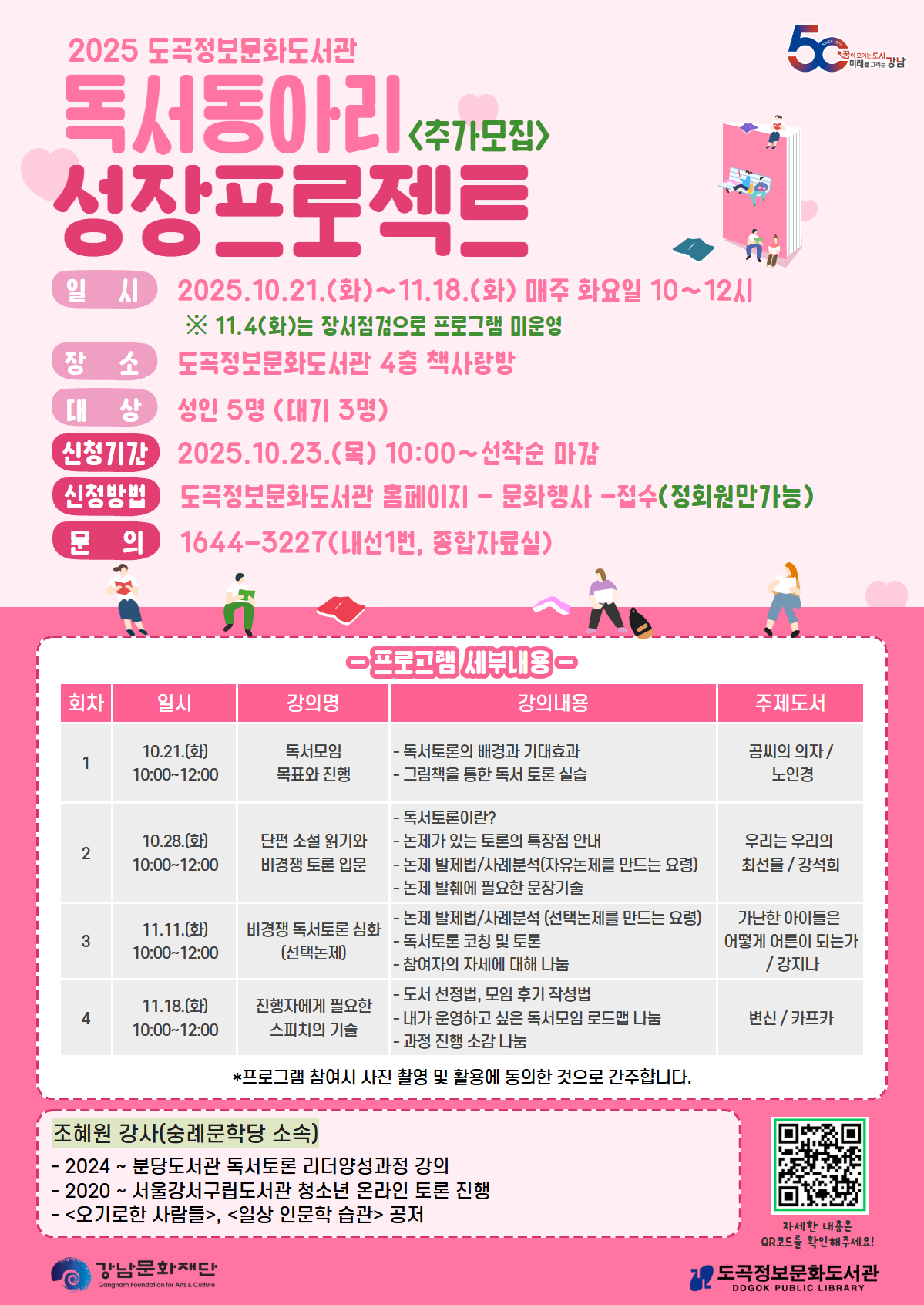 (추가모집) 2025 도곡정보문화도서관 <독서동아리 성장프로젝트>