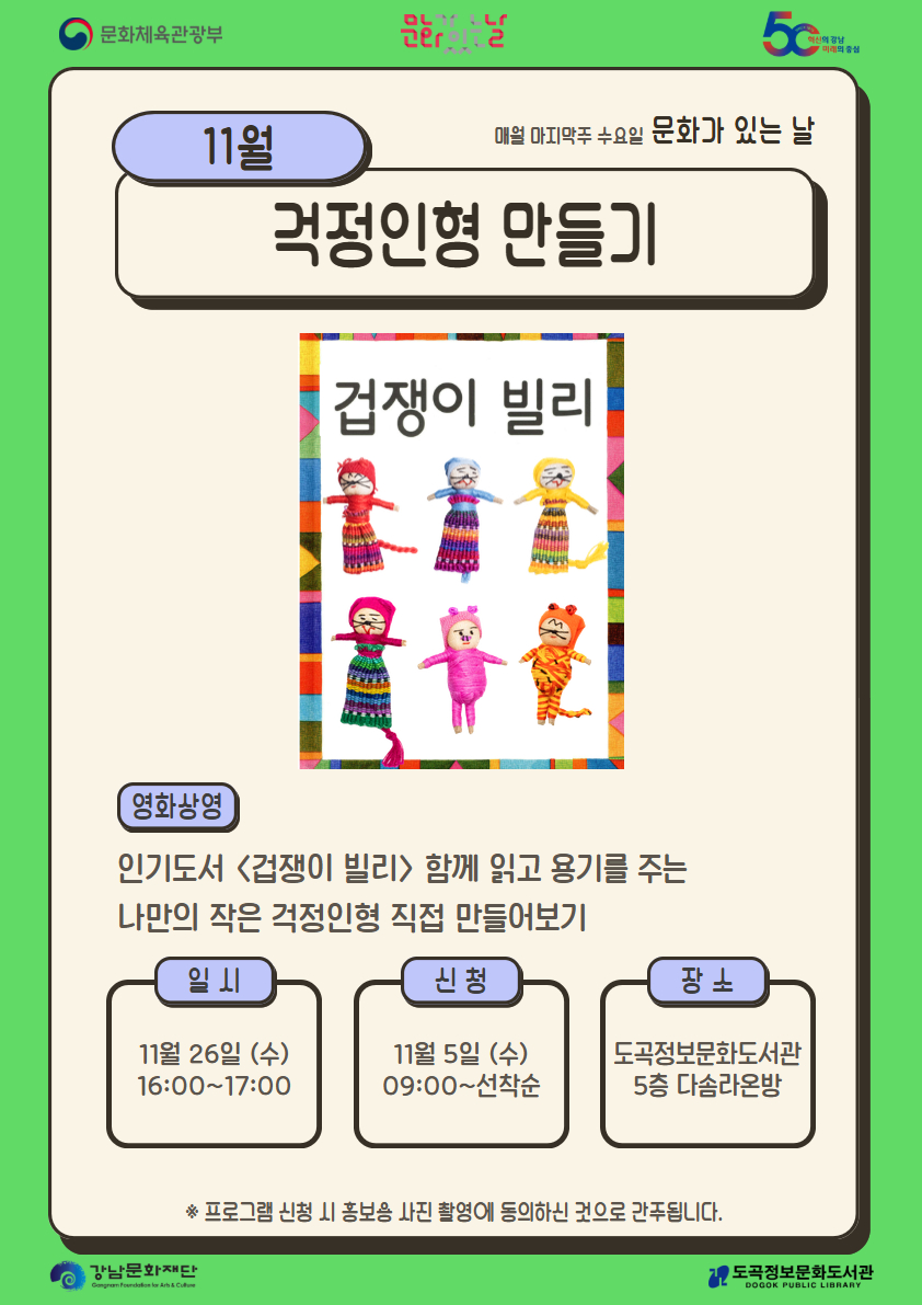겁 많던 주인공 빌리가 걱정인형을 만나 용기를 낸 것처럼, 우리도 작은 인형을 직접 만들어보며 마음속 걱정을 털어내요! 책 속 이야기와 함께하는 특별한 시간, 나만의 ‘걱정인형 친구’를 완성해보세요. 🧑🤝🧑🕺💃 ✔️ 일시 : 2025년 11월 26일 (수요일) 16:00~17:00 ✔️ 대상 : 2017~2019년생 어린이 16명 ✔️ 장소 : 도곡정보문화도서관 5층 다솜라온방 ✔️ 신청 : 2025년 11월 5일 (수요일) 09:00~선착순 (도서관 홈페이지▶문화행사) ▶신청 바로가기