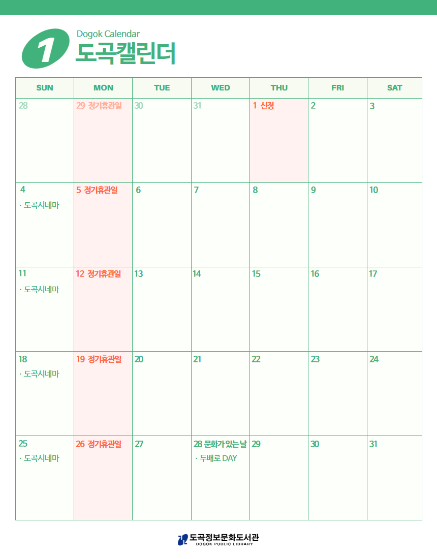📗1월 도곡캘린더입니다!📗 2026년 새해가 밝았습니다! 도곡정보문화도서관 이용자 여러분 모두 새해 복 많이 받으세요! 1월 행사로는 2026년 새롭게 달라진 '도곡시네마'가 있습니다! 기존 어린이 이용자만을 대상으로 운영하던 도곡시네마를, 2026년부터는 좀 더 다양한 연령대를 대상으로 다양한 주제의 영화를 상영하게 되었습니다. 매달 새롭게 엄선되는 도곡시네마! 평소 궁금하던 영화를 도서관에서 만나보세요! ▶도곡시네마 신청 바로가기