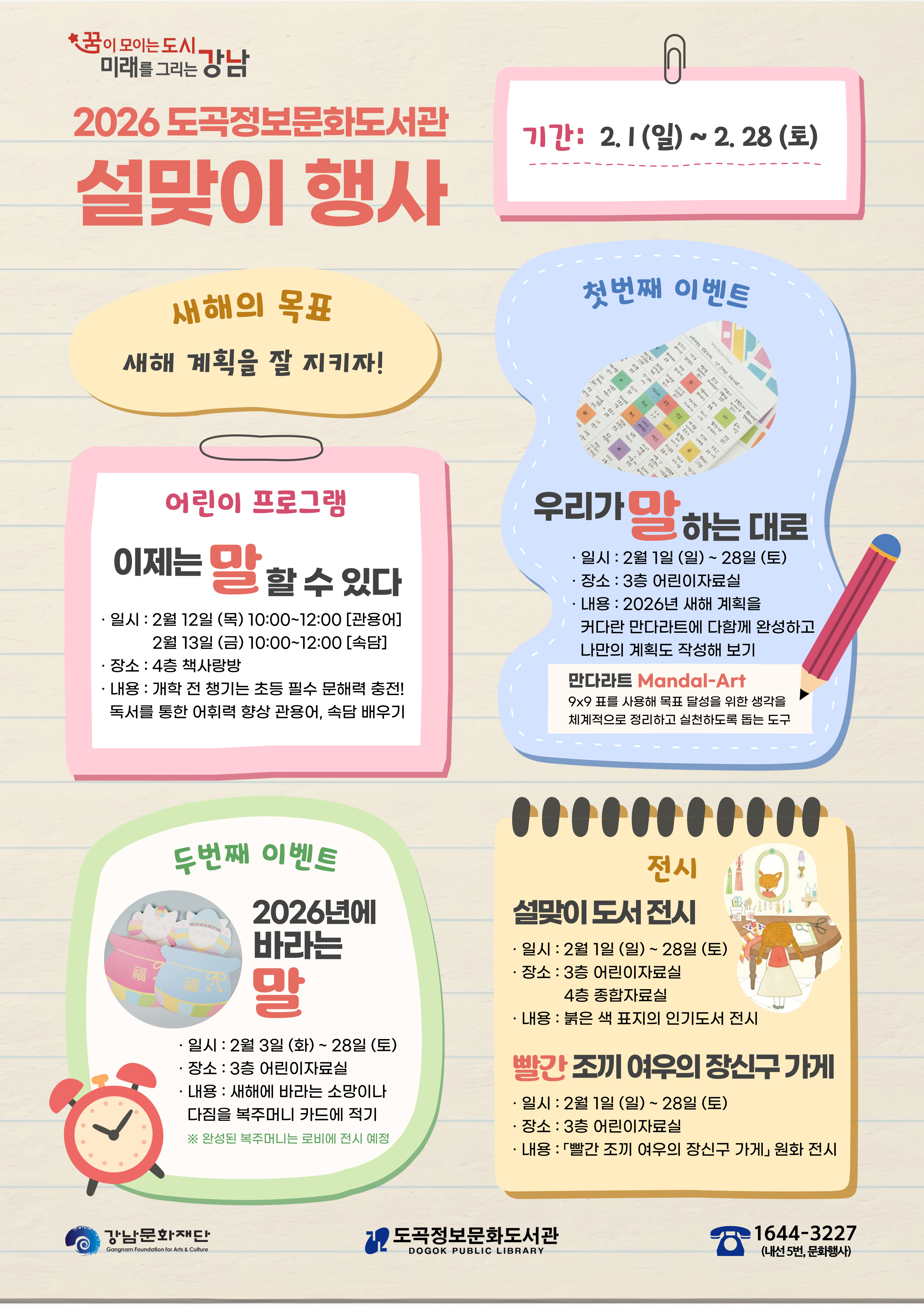 🐎말이 🌱씨가 되는 병오년! 새해 목표를 말로 다짐하자! 책과 말로 여는 도곡정보문화도서관 설맞이 행사가 찾아왔습니다. 📖이제는 말할 수 있다!📖 개학 전 챙기는 초등 필수 문해력 충전! 독서를 통한 어휘력 향상 관용어와 속담배우기 ✔️일시 [관용어] 2. 12.(목) 1~2학년 : 10:00~10:50, 3~4학년 : 11:00~11:50 [속담] 2. 13.(금) 1~2학년 : 10:00~10:50, 3~4학년 : 11:00~11:50 ✔️장소: 4층 책사랑방 ✔️대상: 초등학생 예비 1~2학년, 예비 3~4학년 ✔️신청: 1. 29.(목) 9:00~ 선착순 마감 🏆우리가 말하는 대로💯 2026년 새해 계획을 커다란 만다라트 판에 다함께 완성하고, 나만의 계획도 작성해보기 ✔️기간: 2. 1.(일) ~ 2. 28.(토) ✔️장소: 3층 어린이자료실 👛2026년에 우리가 바라는 말👛 새해에 바라는 소망이나 다짐을 복주머니 카드에 적기 ※ 완성된 복주머니는 로비에 전시 예정 ✔️기간: 2. 3.(화) ~ 2. 28.(토) ✔️장소: 3층 어린이자료실 📕설맞이 도서 전시📕 붉은 색 표지의 인기도서 전시 ✔️기간: 2. 1.(일) ~ 2. 28.(토) ✔️장소: 3층 어린이자료실 · 4층 종합자료실 🦊빨간 조끼 여우의 장신구 가게🦊 그림책 원화전시 ✔️기간: 2. 1.(일) ~ 2. 28.(토) ✔️장소: 3층 어린이자료실