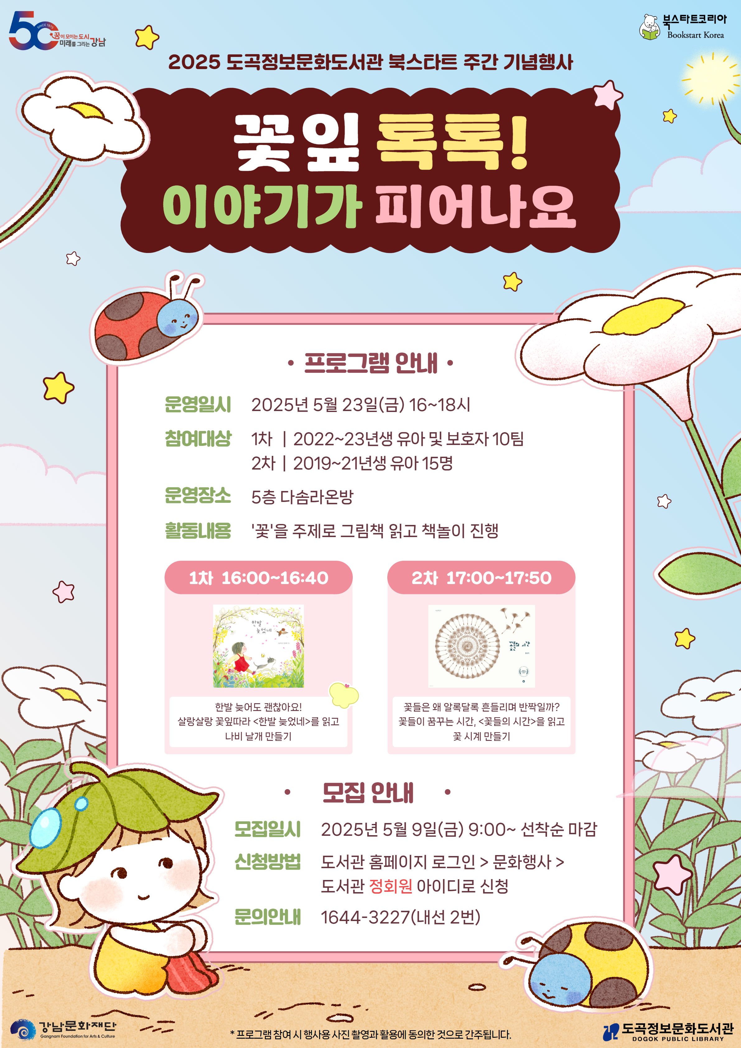| 행사명 | 도곡정보 [북스타트 주간] 꽃잎 톡톡, 이야기가 피어나요 (2차 17:00~17:50) |