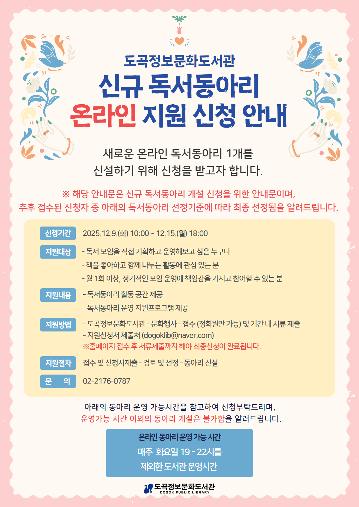 | 행사명 | 도곡정보 2025 도곡정보문화도서관 신규 온라인 독서동아리 지원신청 안내 |