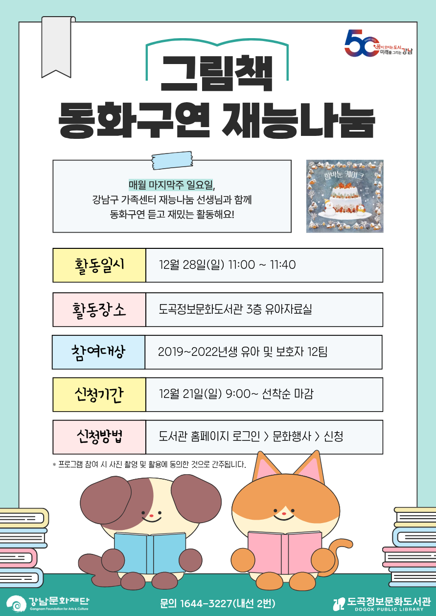 | 행사명 | 도곡정보 [재능기부] 그림책 동화구연 재능나눔 프로그램(12월) |