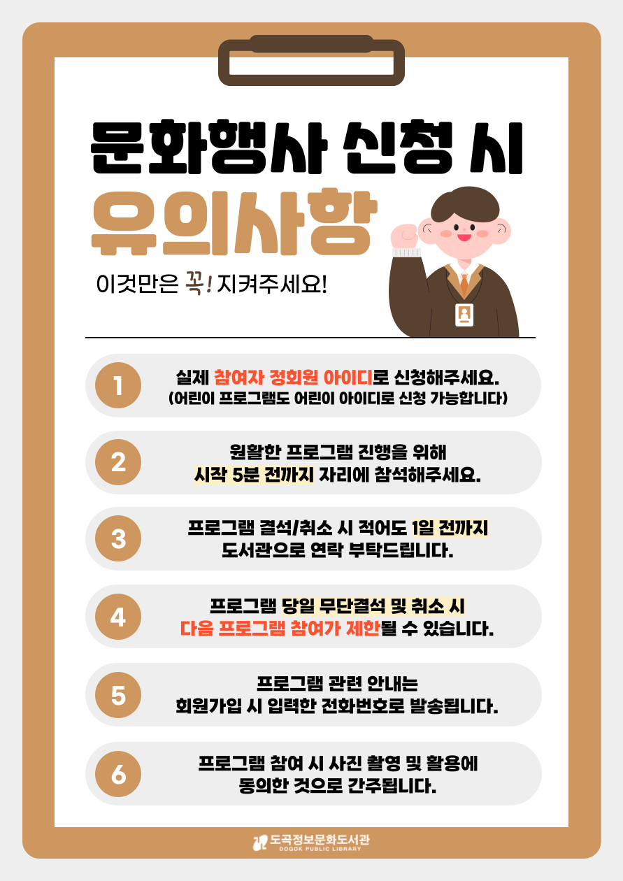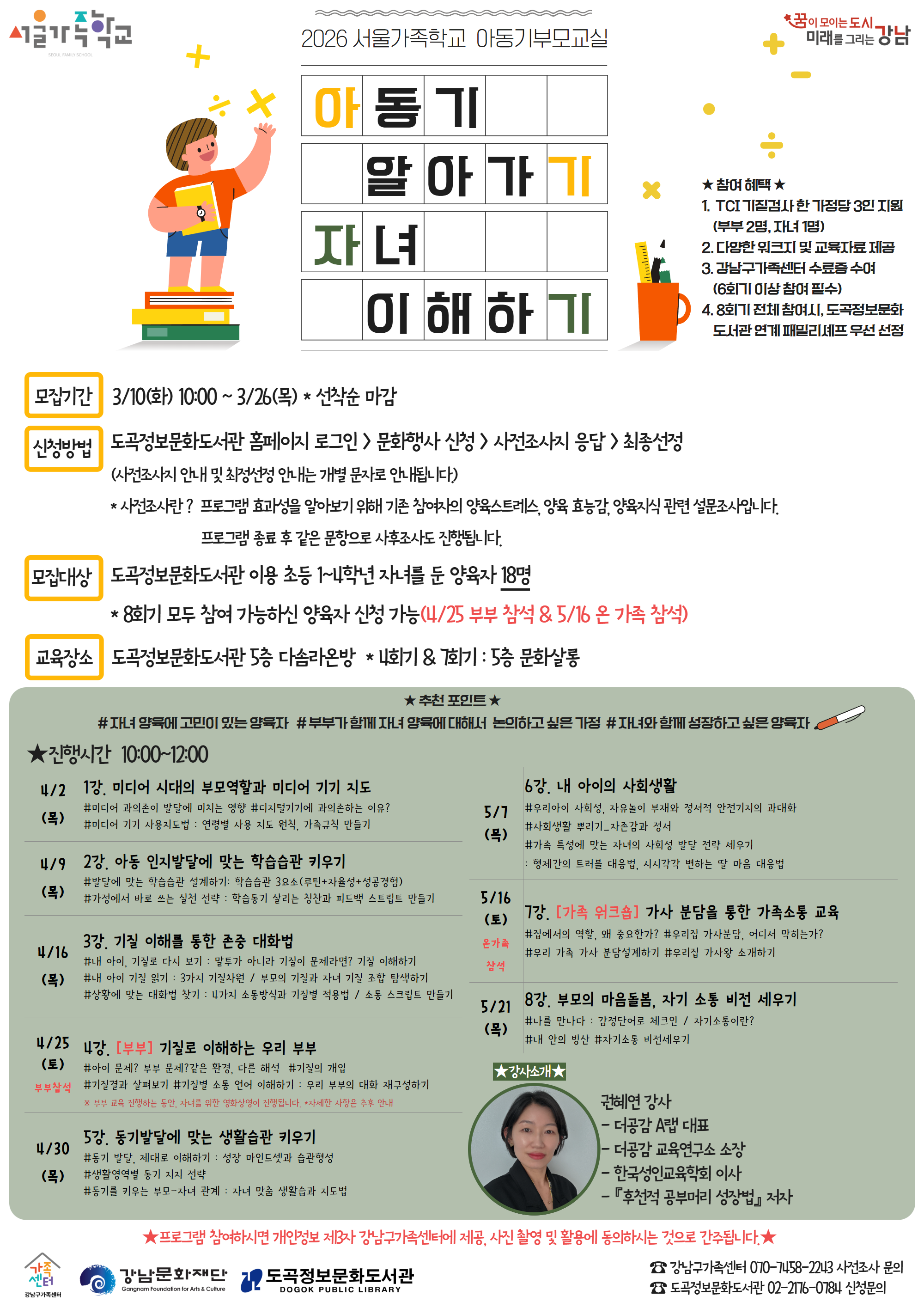 도곡정보문화도서관과 강남구가족센터가 연계하여 아동기 발달과 양육에 필요한 정보 및 양육기술을 학습해 부모와 자녀가 함께 성장하는 💗부모교육 프로그램을 운영합니다! 🌟 총 8회기 모두 참석 가능하신 양육자분만 신청 부탁드립니다. 🌟 4/2(목) ~ 5/21(목) 매주 목요일 10:00~12:00 5층 다솜라온방 * 4회기 🙋🏻♀️🙋🏻♂️부부 동반 교육 & 7회기 👨👩👧👦온 가족 워크숍으로 목요일➡️토요일, 5층 문화살롱에서 진행됩니다. (4회기 부부 교육을 진행하는 동안, 자녀를 위한 영화 상영도 함께 진행될 예정입니다.) 참여혜택으로 TCI 기질검사(부모 2명 + 자녀 1명), 워크지 및 교육자료, 강남구가족센터 수료증(6회기 이상 참여 필수)이 제공됩니다. 또한, 8회기 전체 참여 시 추후 💫패밀리셰프 프로그램에 우선 선정 기회💫가 주어지니 많은 참여 부탁드립니다. 사전-사후조사가 필수 연계로 신청 후 사전조사지에 응답하지 않을 경우 실제 참여가 어렵습니다. 다양한 참여 혜택이 있는 프로그램으로 무단결석 및 당일취소 시 다음 프로그램 참여가 제한됩니다. 더 많은 분들이 참여할 수 있도록 배려와 양해 부탁드립니다. 자세한 내용은 홍보물과 첨부파일 강의계획서를 확인해주세요! ![]()