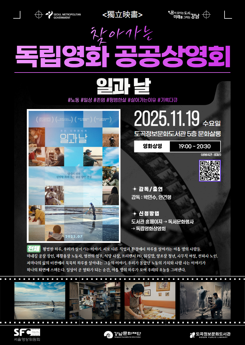 찾아가는 독립영화 공공상영회 11월 상영작 안내🎥 🧑🔧 11월 상영작 : <일과 날> 🧑🚒상영일시 : 11월 19일 (수) 19:00~20:30 👷장소 : 5층 문화살롱 🎬접수 바로가기 평범한 하루, 우리가 살아가는 이야기. 서로 다른 직업과 환경에서 하루를 살아가는 아홉 명의 사람들. 마네킹 공장 장인, 재활용장 노동자, 염전의 염부, 식당 사장, 프리랜서 PD, 워킹맘, 양조장 청년, 사무직 여성, 그리고 전파사 노인. 저마다의 삶의 터전에서 묵묵히 하루를 살아내는 그들의 이야기. 끊임없이 변화하는 세상 속에서 일과 삶의 무게를 짊어진 이들이 만들어가는 하루. 우리가 몰랐던 노동의 가치와 사람 사는 이야기가 하나의 화면에 스며든다. 일상이 곧 영화가 되는 순간, 아홉 명의 하루가 모여 우리의 오늘을 그려낸다.