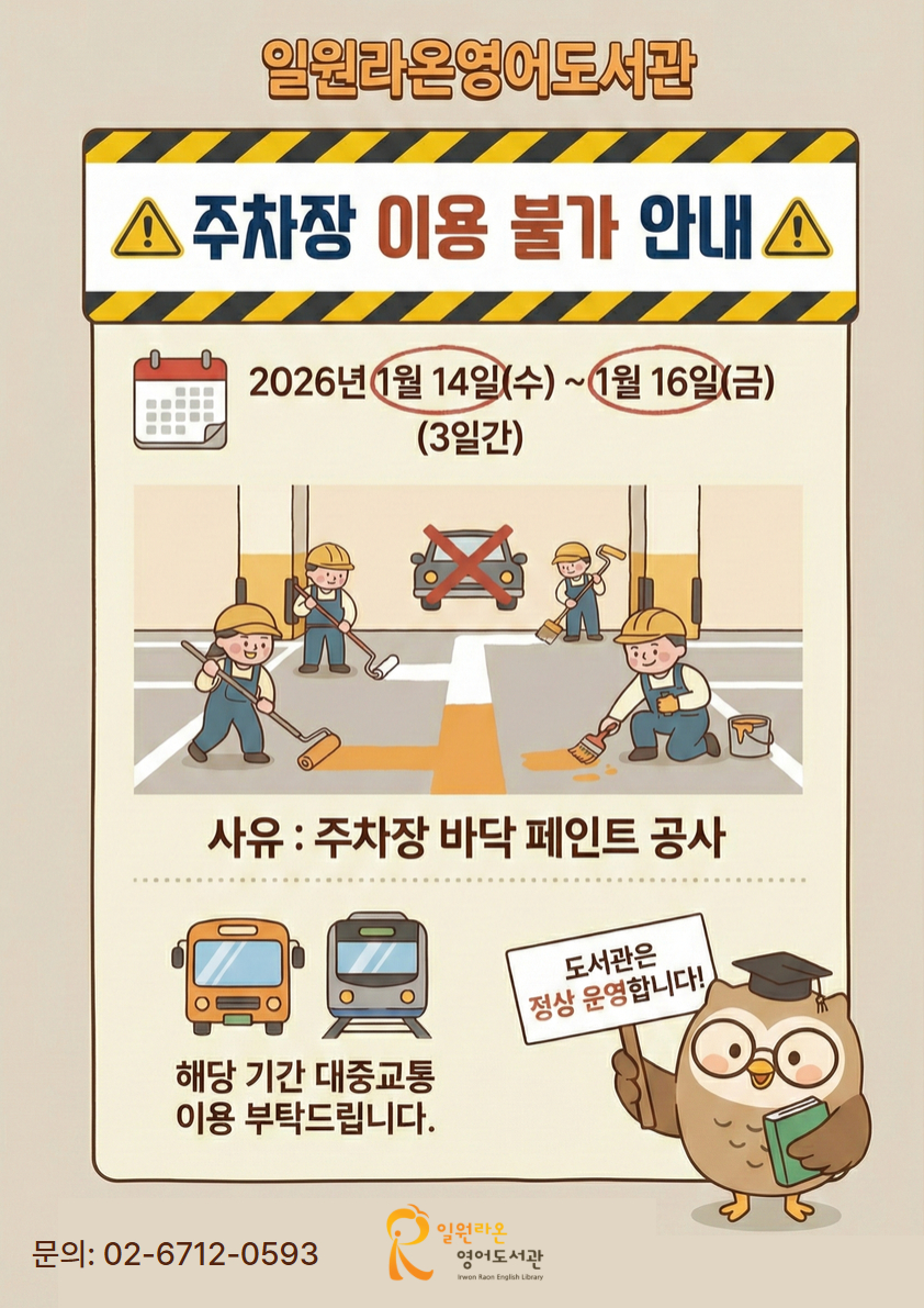 일원라온영어도서관 주차장 바닥 공사에 따른 이용 불가 안내 (1/14~1/16)