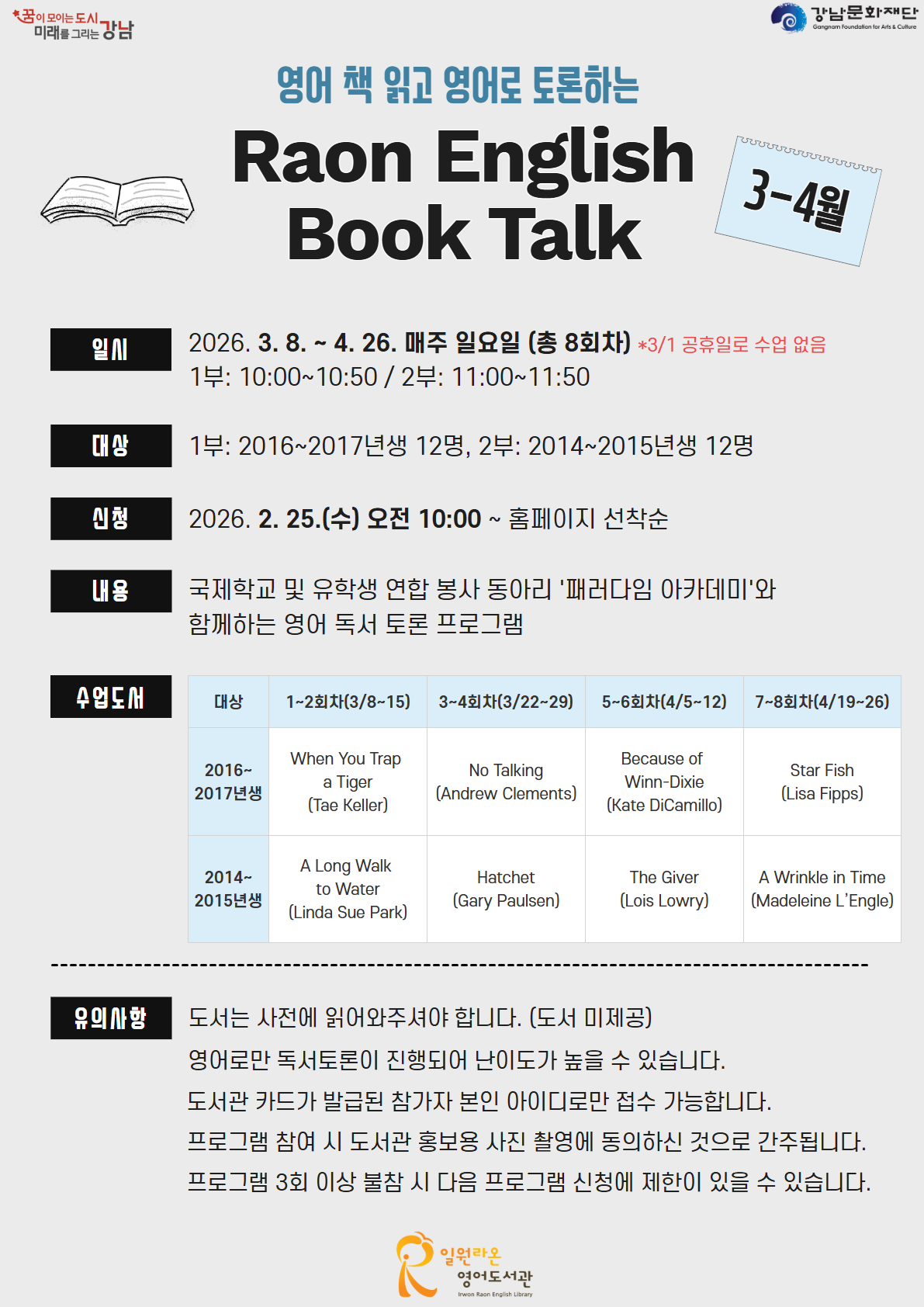 | 제목 | 2026년도 3-4월 RAON ENGLISH BOOK TALK 프로그램 모집 안내 |