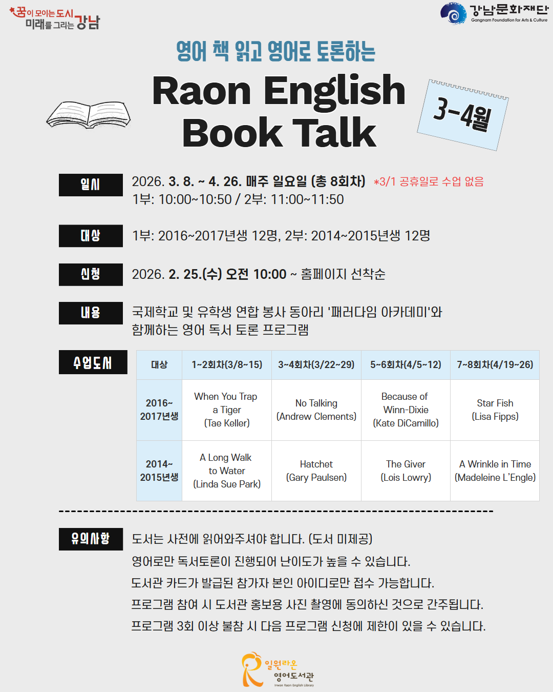 | 행사명 | 일원라온영어 2026년도 3-4월 RAON ENGLISH BOOK TALK - 1부 |