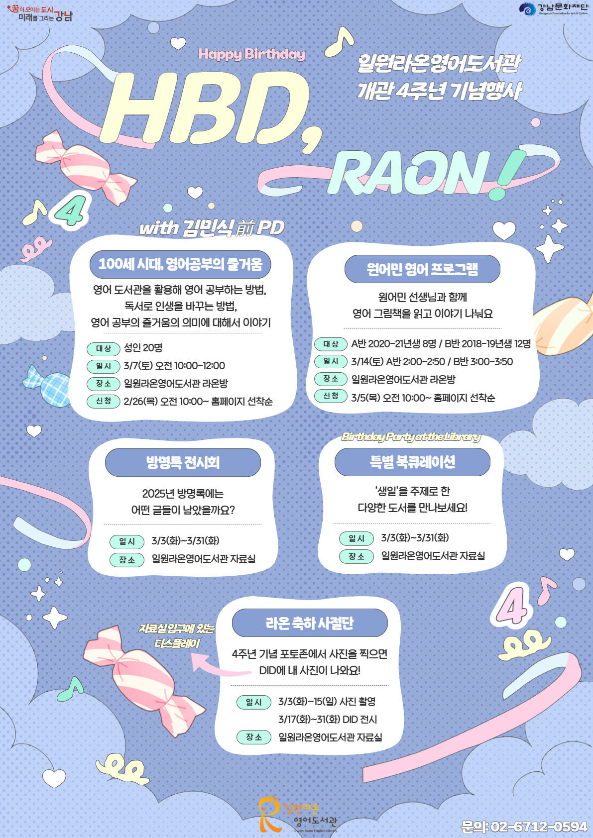 일원라온영어도서관이 개관 4주년을 맞이 했습니다. 4주년을 기념하여 다양한 프로그램과 이벤트를 준비했으니, 3월에도 도서관으로 많이 놀러와 주세요! <프로그램> - 100세 시대, 영어공부의 즐거움 : 김민식 (전)MBC PD님과 함께 영어 도서관을 활용해 영어 공부하는 방법, 영어 공부의 즐거움의 의미에 대한 이야기를 나눠요! - 원어민 영어 프로그램 : 원어민 선생님과 함께 영어 그림책 읽고 이야기 나눠요! <전시 및 이벤트> - 방명록 전시회 : 2025년도 방명록에 남겨진 소중한 이야기들을 만나보세요! - 특별 북큐레이션 'Birthday Party at the Library' : 생일을 주제로 한 다양한 책들을 만나보세요! - 라온 축하 사절단 : 4주년 기념 포토존에서 사진을 찍으면, DID에 업로드해 드려요! 올해도 많은 사랑 부탁드리며, 자세한 내용은 포스터를 참고해주세요! ![]() |