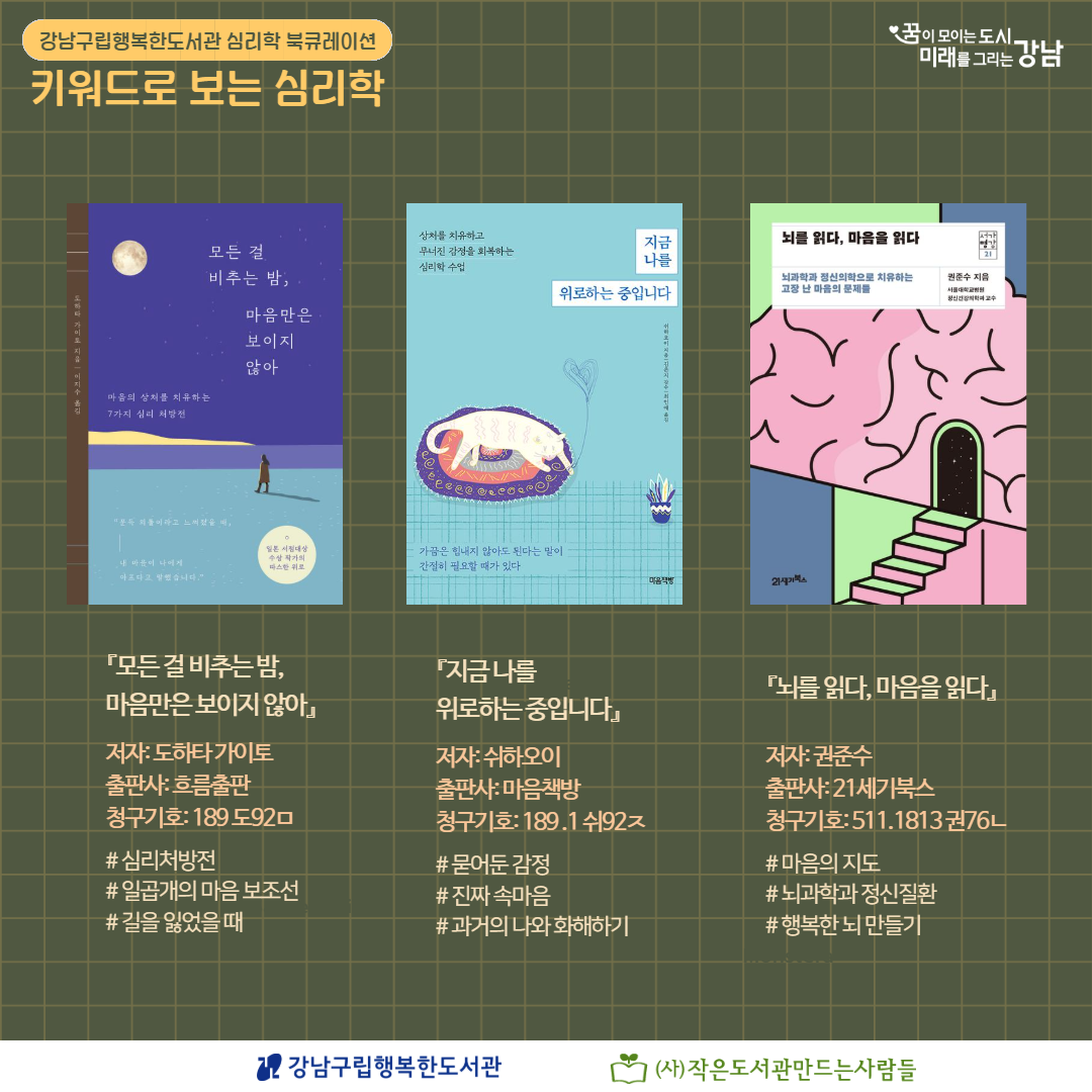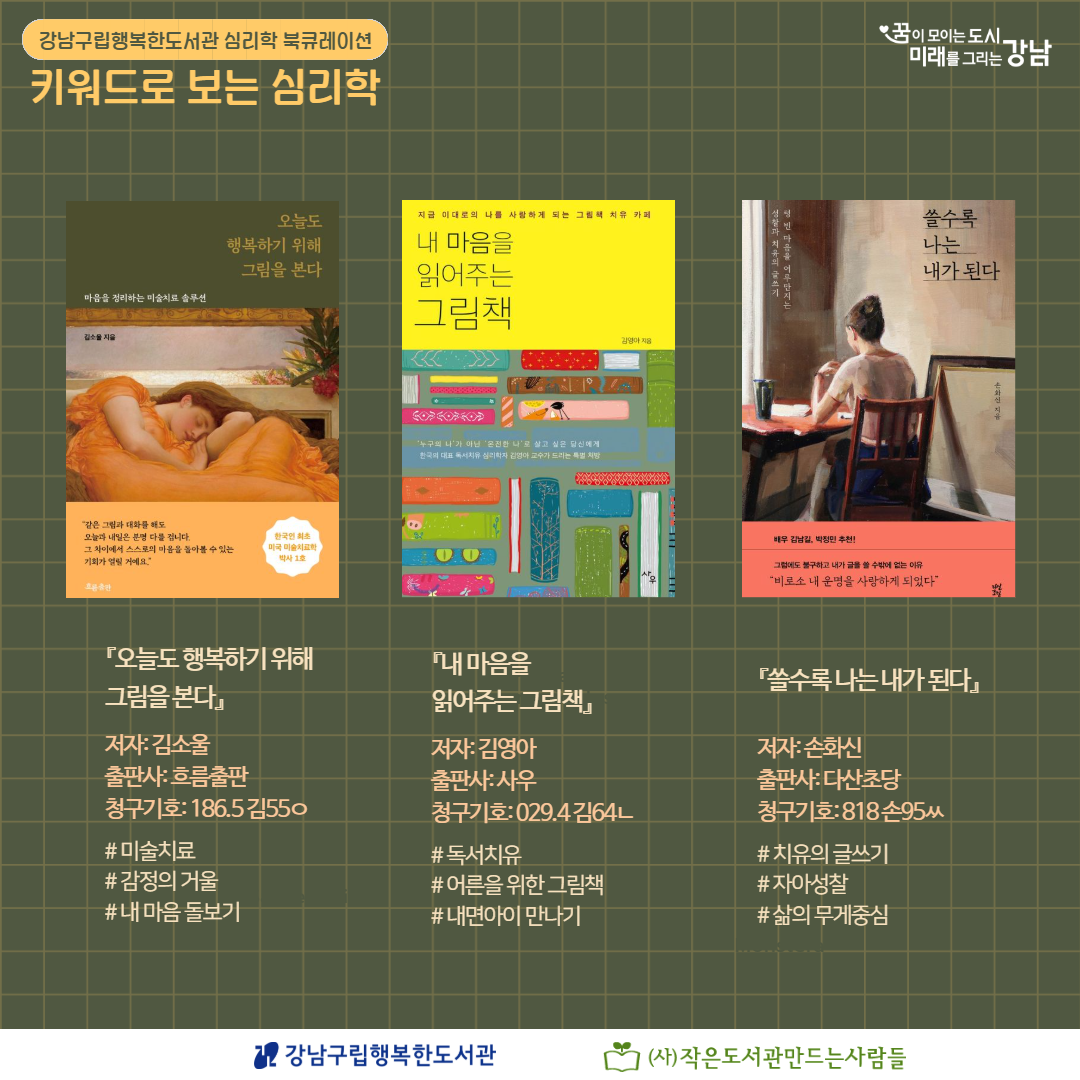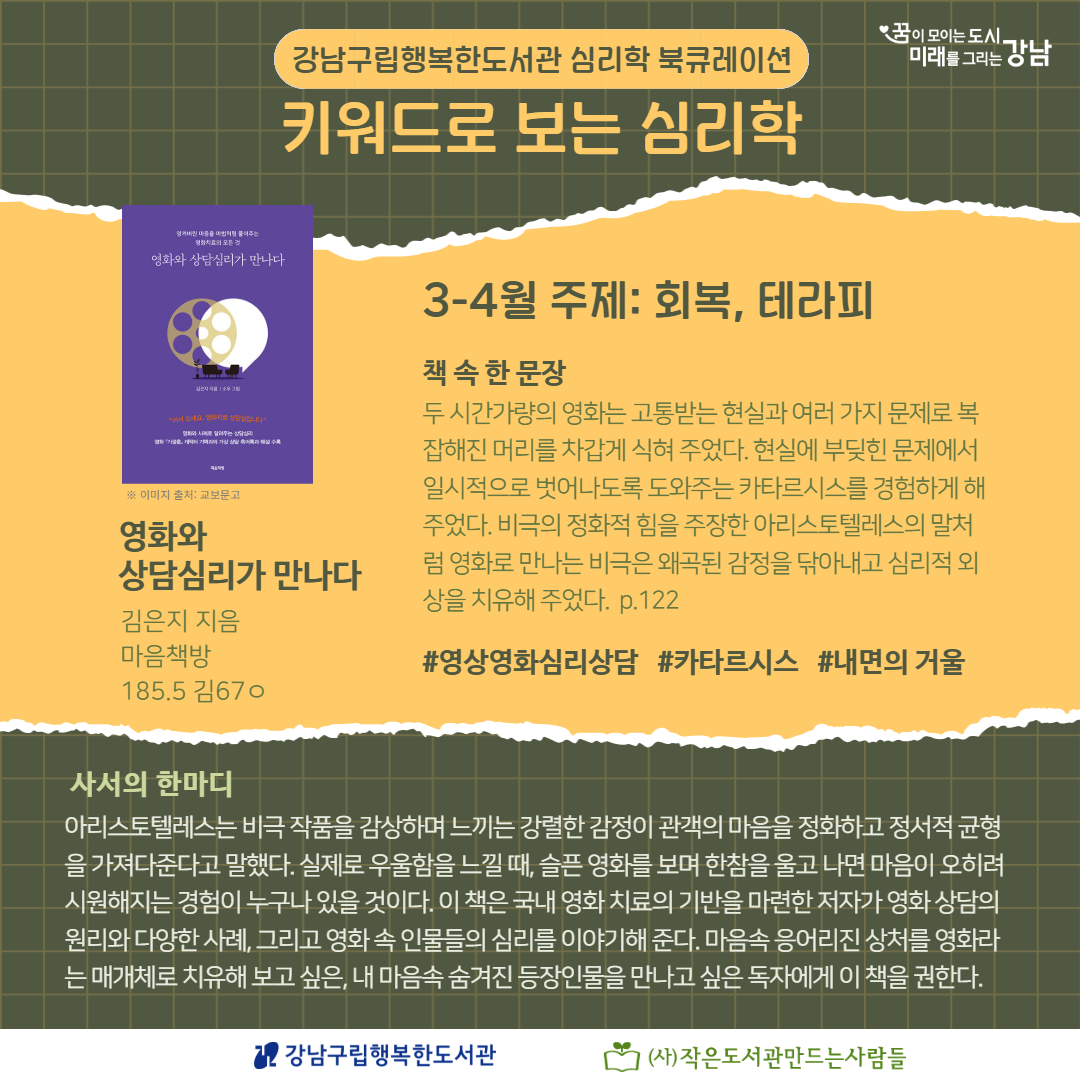 강남구립행복한도서관 심리학 북큐레이션 <키워드로 보는 심리학> 2026년 3~4월 주제는 '회복, 테라피'입니다.