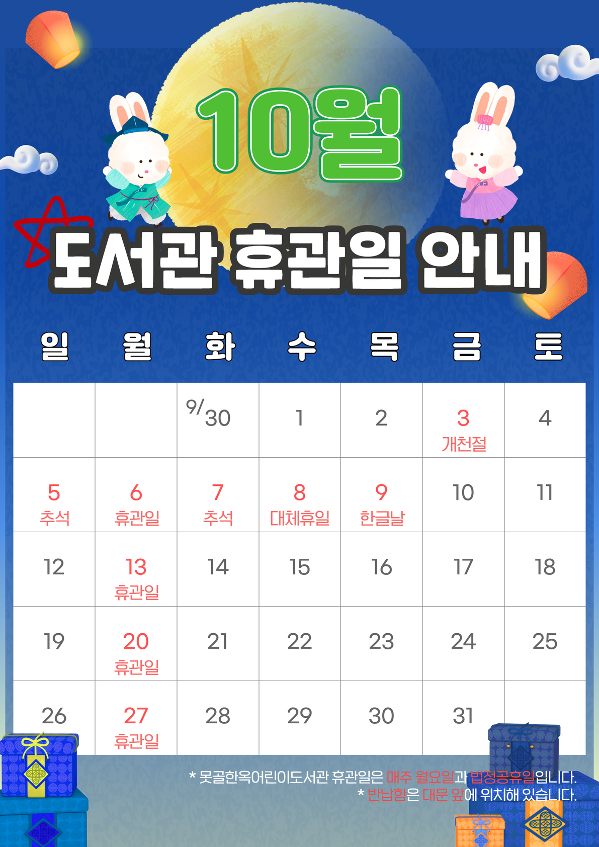 못골한옥어린이도서관 2025년 10월 휴관일 안내