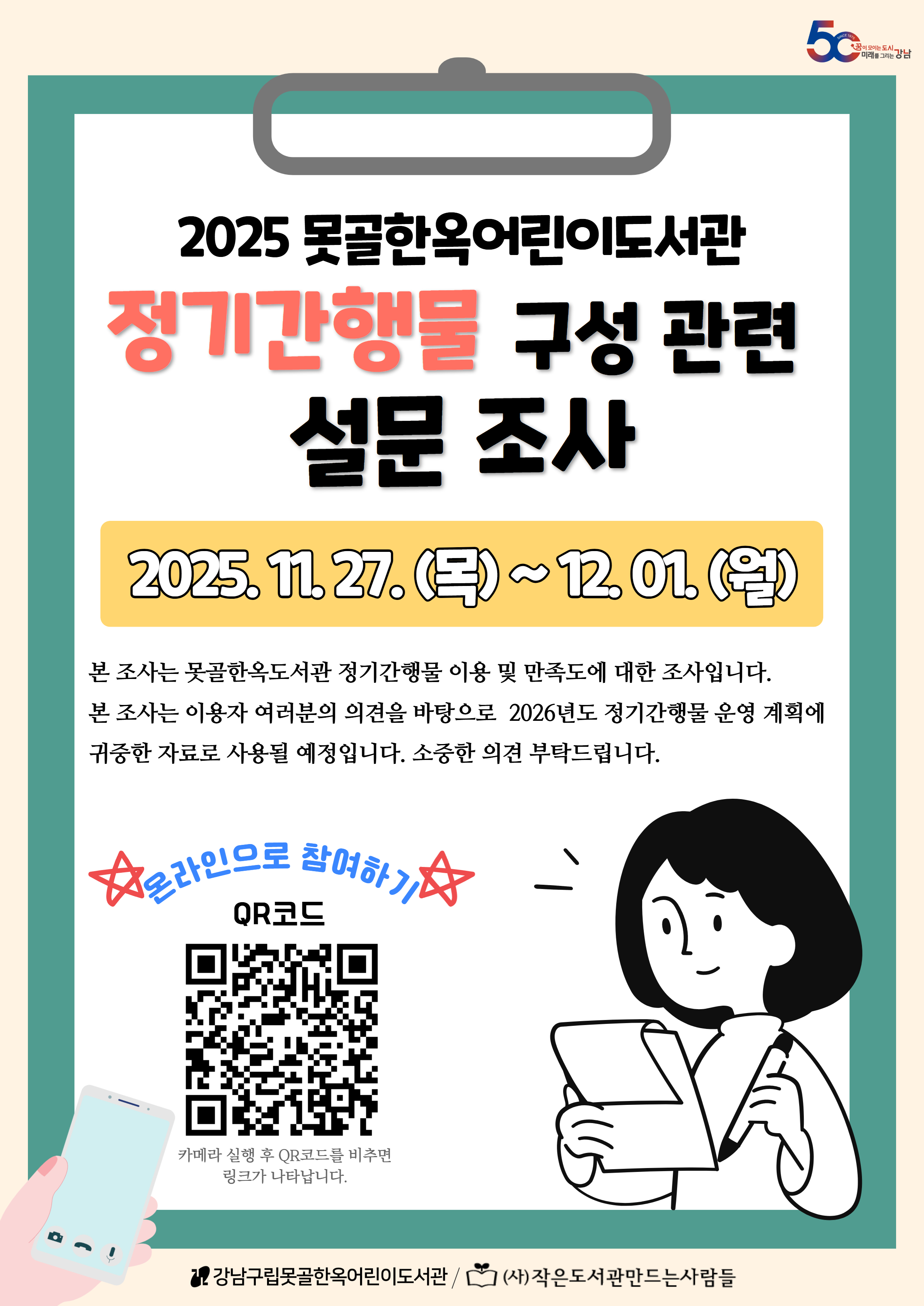 안녕하세요. 못골한옥어린이도서관입니다. 도서관에서 구독중인 정기간행물 이용 및 만족도에 대해 알아보고자 설문을 진행합니다. 본 조사는 이용자 여러분의 의견을 바탕으로 2026년도 정기간행물 운영 계획에 귀중한 자료로 사용될 예정입니다. 소중한 의견 부탁드립니다. ►설문기간 : 2025. 11. 27. (목) ~ 12. 01. (월) ►참여방법 : 도서관에 비치된 설문지를 작성하거나, 아래 링크 혹은 QR코드 접속 ►설문링크 : https://moaform.com/q/iot118 ![]() |