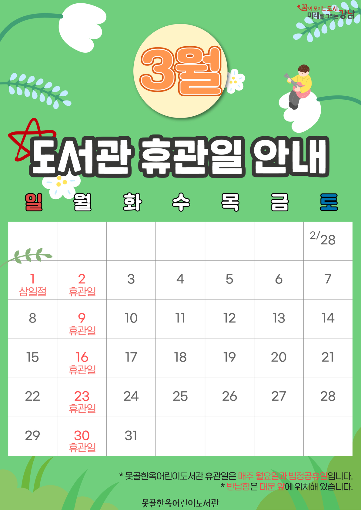 못골한옥어린이도서관 2026년 3월 휴관일 안내