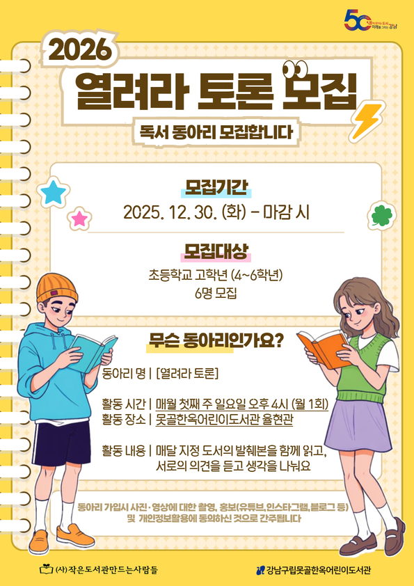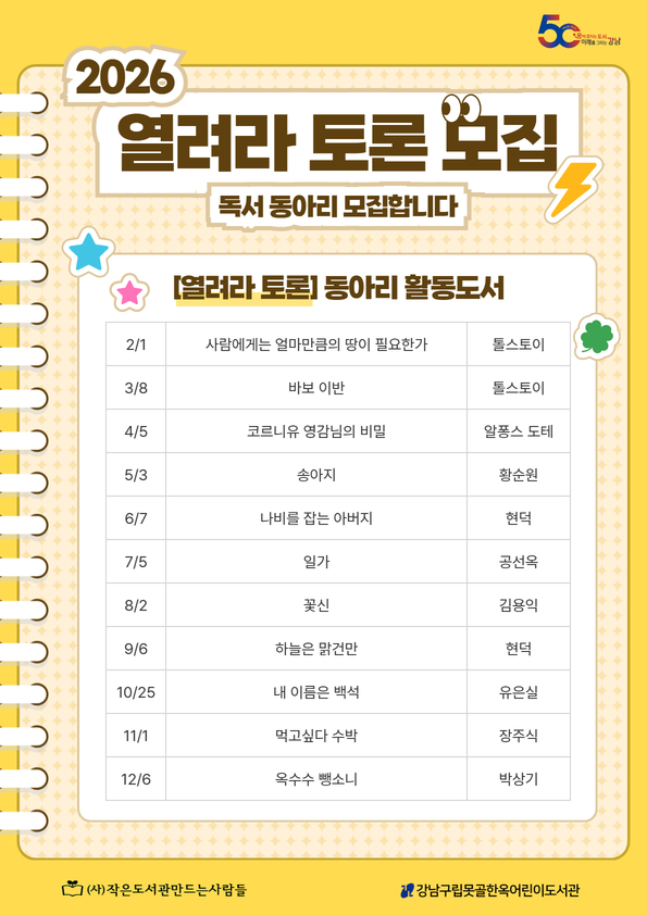 2026년 2월부터 12월까지 진행되는 독서동아리입니다. ※ 도서관 사정에 의해 일정이 변경될 수 있습니다. ![]() ![]()