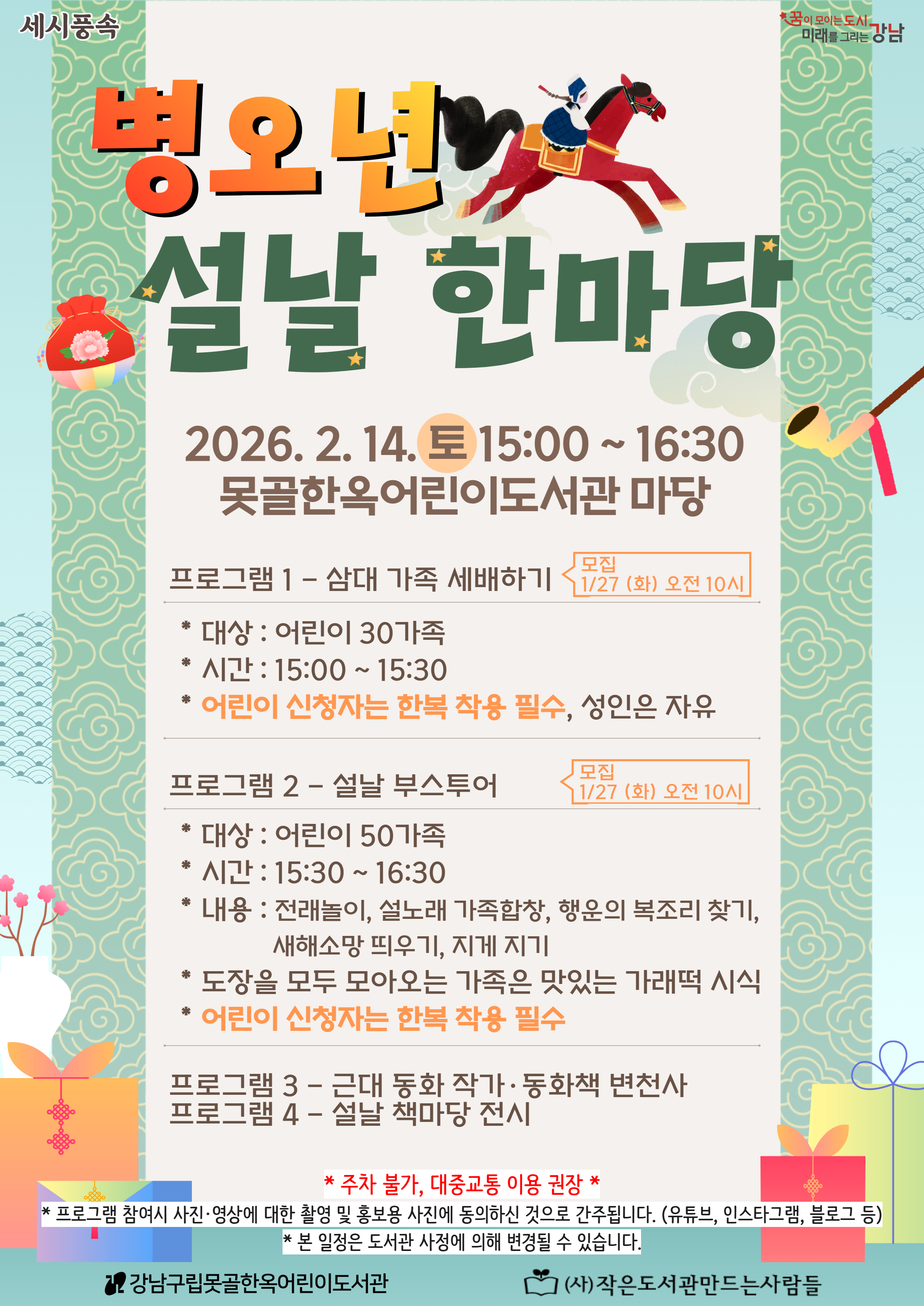 * 2월 14일 도서관 프로그램 일정 안내 - 15시 ~ 15시 30분 : 삼대 가족 세배하기 - 15시 30분 ~ 16시 30분 : 설날 부스투어 (삼대 가족 세배하기, 부스투어는 별개로 모집이 진행되며, 중복 신청 가능합니다.) * 한복을 입고 온 어린이들 대상으로 가래떡 시식이 진행됩니다. (신청자(어린이) 한복 착용 필수!) * 신청한 어린이 수에 맞춰 가래떡 시식이 진행되오니, 자녀 수에 맞춰 신청 바랍니다. (단, 자녀 이름으로 회원가입이 안되어 있을 경우 부모님 이름으로 신청 가능) ![]()