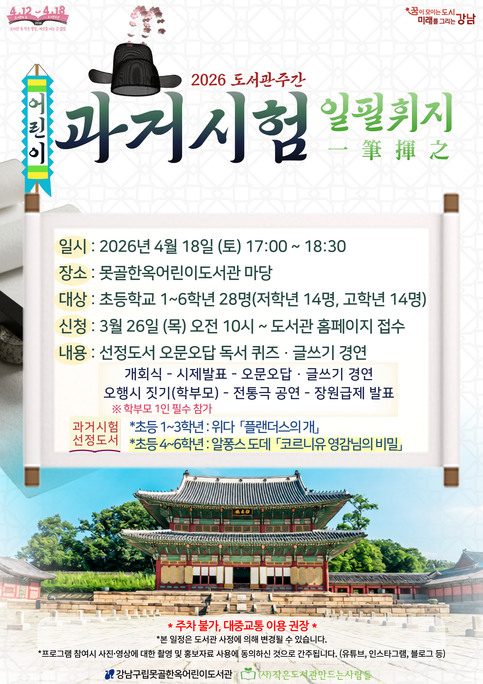 | 행사명 | 못골한옥 [도서관주간] 2026 어린이 과거시험 일필휘지-초등 4~6학년 |