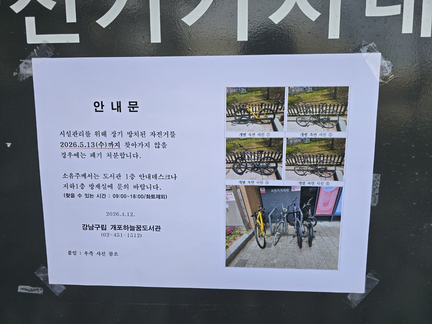 [자전거 주차장 내 장기 무단 방치 자전거 안내 (4대)] 현재 개포하늘꿈 도서관 앞 자전거 주차장에 장기간 무단 방치되어 이용객의 통행 방해 및 미관 저해를 초래하는 자전거(4대)에 대하여, 관련 법령에 의거하여 다음과 같이 수거 및 보관 사실을 공고합니다. 1. 법적 근거