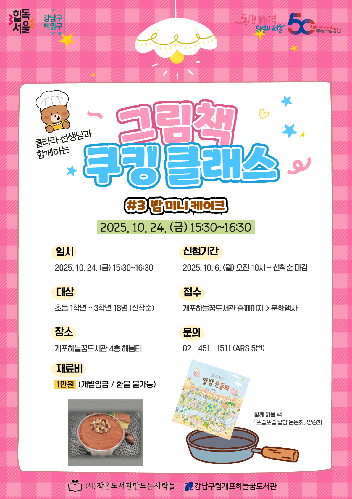 클라라 선생님과 함께하는 <그림책 쿠킹 클래스>를 진행합니다.ฅ≽^•⩊•^≼ฅ 사서 선생님과 재미있게 그림책도 함께 읽고! 맛있는 요리도 만들어 봐요~ <신청 전 꼭 읽어주세요!> *2025. 10. 10. ~ 10. 31. 15:30~16:30 (매주 금) 총 4회차로 진행됩니다. *회차별로 각각 개별 접수하셔야 합니다. (1회차만 참여를 원하는 경우 1회차 신청, 1~3회차만 참여를 원하는 경우 1,2,3회차 모두 신청) *회차별 재료비 1만원(개별 입금/환불 불가능), 입금 안내는 추후 문자로 안내할 예정 10월 31일에 진행하는 4회차 요리는 '오란다 강정' 입니다. ![]() ![]() ○일시 : 2025. 10. 24.(금요일) 15:30~16:30 ○대상 : 초등학생 1~3학년 18명 ○장소 : 개포하늘꿈도서관 4층 해봄터 ○접수 : 2025년 10월 6일(월) 오전 10시 ~ (선착순) ○신청방법 : 개포하늘꿈도서관 홈페이지 ○문의 : 02-451-1511 / ARS 5번 ※프로그램 신청시 참여자 본인의 아이디로 신청 하셔야 합니다. ※프로그램 신청 시 홍보용 사진 촬영 및 사용에 동의하시는 것으로 간주됩니다. ※프로그램 관련 공지사항은 문자로 발송되오니 회원가입 시 입력된 휴대폰번호 확인 부탁드립니다. |