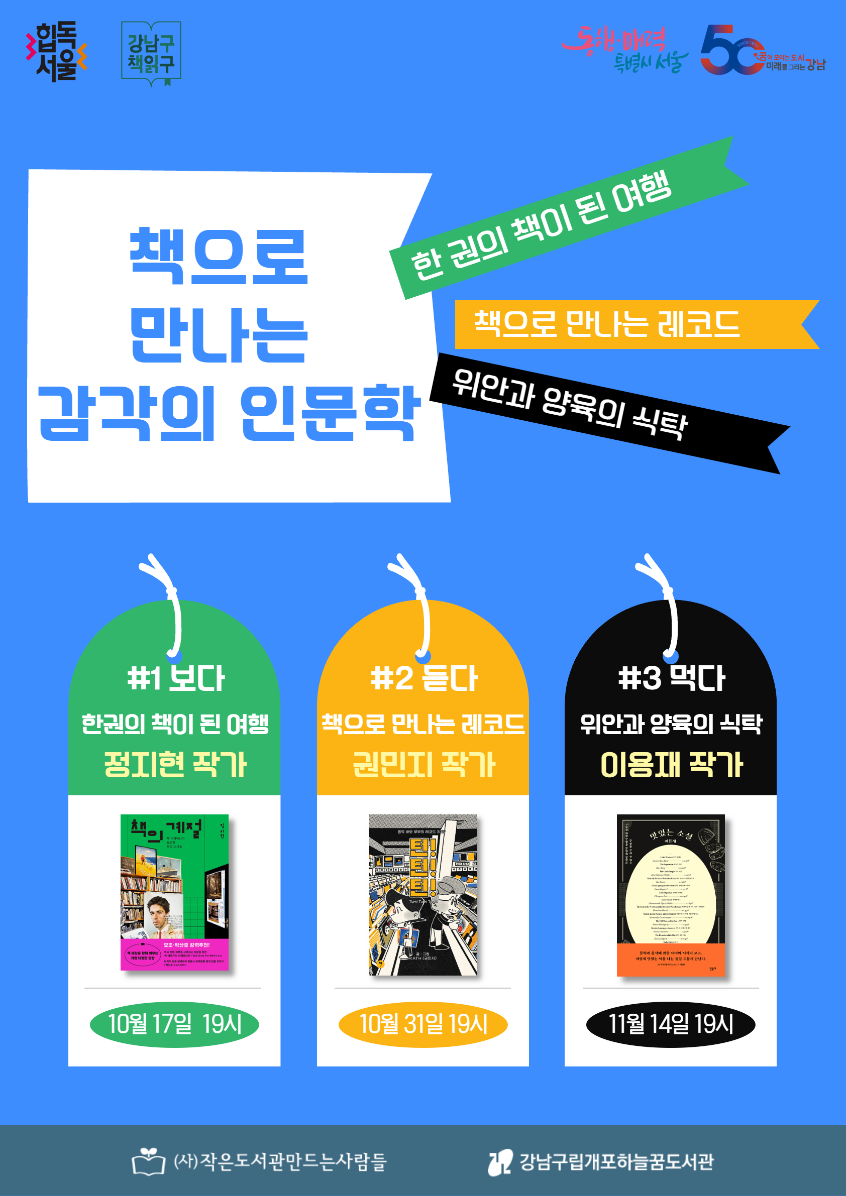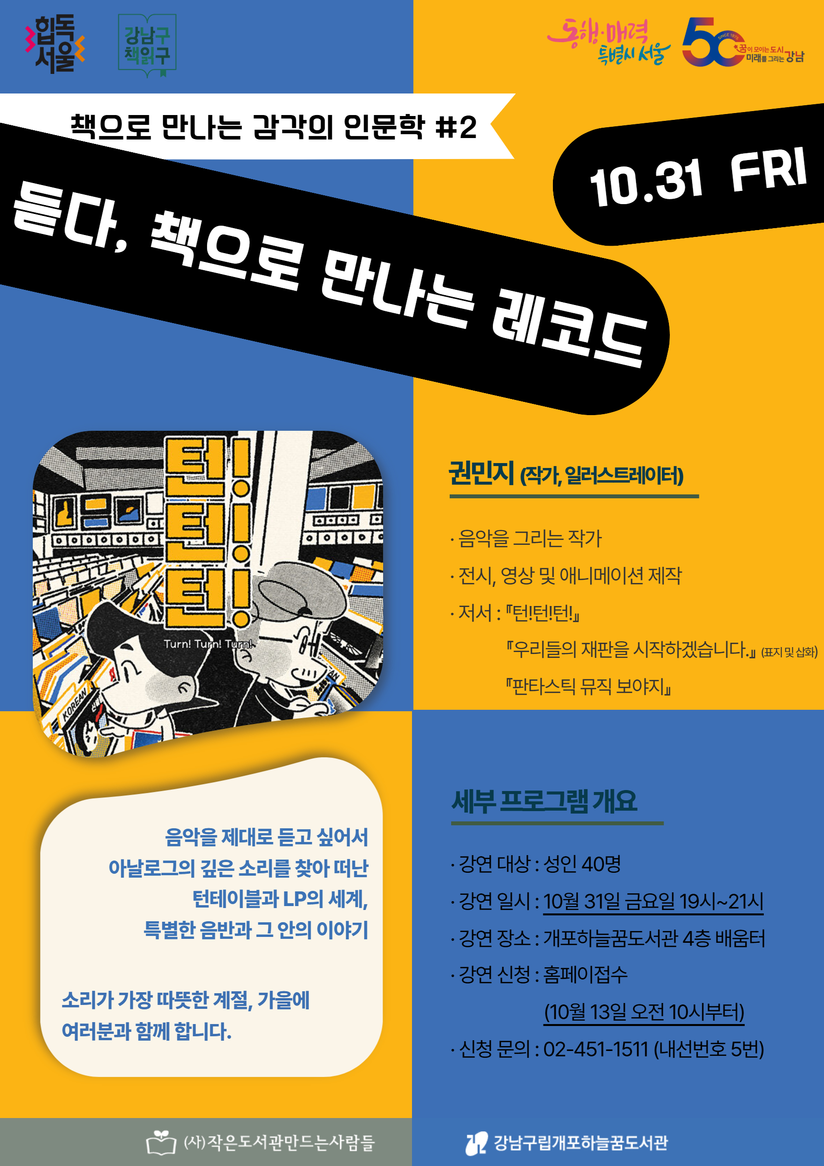 <책으로 만나는 감각의 인문학> #2 듣다, 책으로 만나는 레코드 「턴!턴!턴!」의 저자, 음악을 그리는 권민지 작가님과 함께, 턴테이블과 LP의 역사부터 사용법, 음반 선택 팁, 그리고 특별한 음반 이야기까지 아날로그 음악의 매력을 직접 듣고 느껴봅니다. 가을, 아날로그의 깊은 소리에 여러분을 초대합니다. ![]() ![]() ○ 일시 : 2025년 10월 31일(금) 19:00 ~ 21:00 ○ 장소 : 개포하늘꿈도서관 4층 배움터 ○ 대상 : 성인 40명 ○ 접수 : 2025년 10월 13일 (월) 오전 10시 ~ 선착순 ○ 신청방법 : 개포하늘꿈도서관 홈페이지 온라인 접수 ○ 문의 : 02-451-1511 / ARS 5번 ※ 프로그램 신청시 참여자 본인의 아이디로 신청 하셔야 합니다. ※ 프로그램 신청 시 홍보용 사진 촬영 및 사용에 동의하시는 것으로 간주됩니다. ※ 프로그램 관련 공지사항은 문자로 발송되오니 회원가입 시 입력된 휴대폰번호 확인 부탁드립니다. |