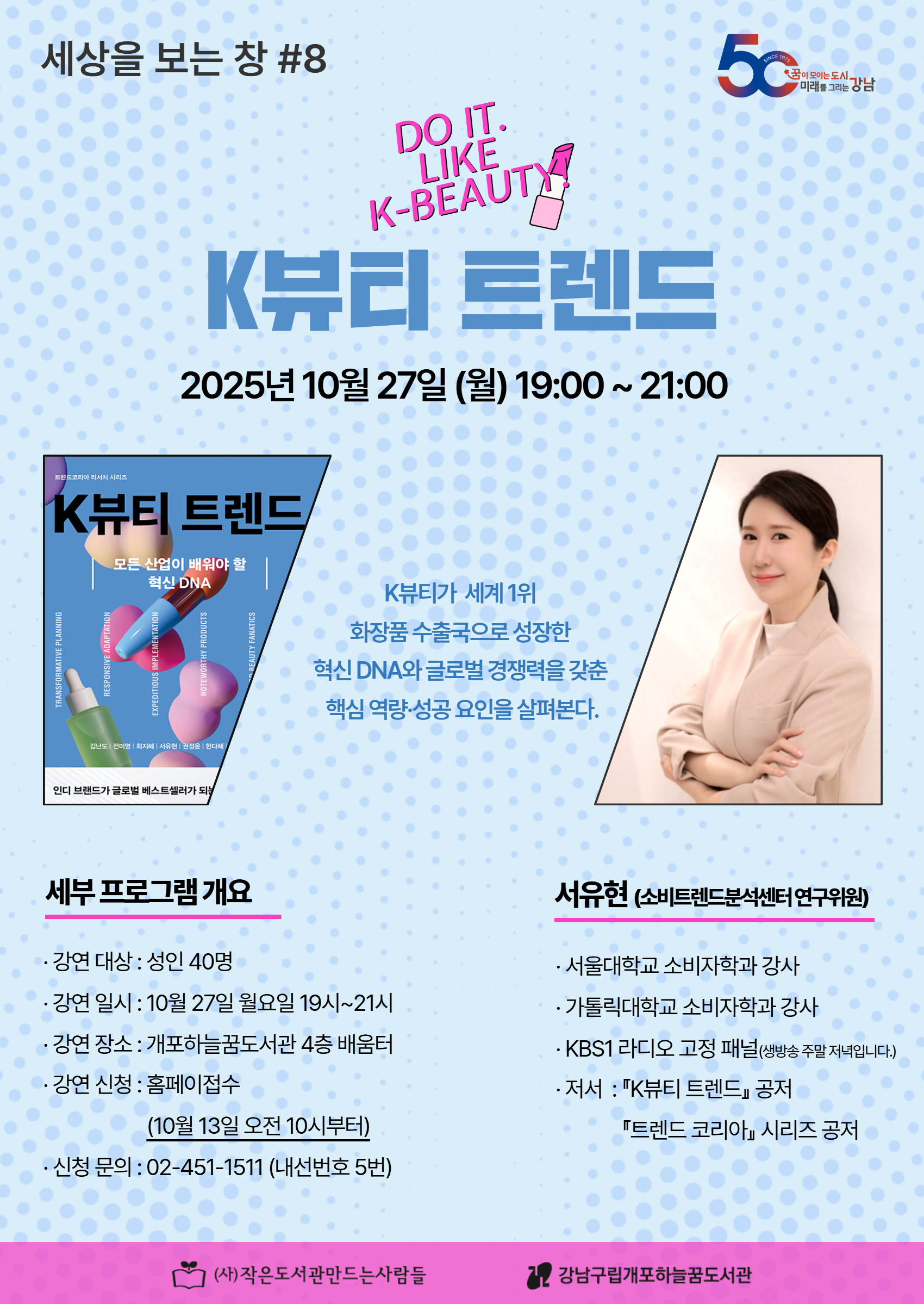 <세상을 보는 창 #8 K뷰티 트렌드> K뷰티가 세계 1위 화장품 수출국으로 성장하기까지, 그 이면에는 혁신적인 산업 생태계와 독창적인 성장 전략이 숨어 있습니다. 이번 <세상을 보는 창 #8 K뷰티 트렌드>에서는 소비트렌드분석센터 연구위원이자「트렌드 코리아」 시리즈의 공저자인 서유현 박사님을 모시고, 한국 화장품 산업이 글로벌 시장에서 경쟁력을 확보하게 된 혁신 DNA, 성공 요인, 그리고 지속 가능한 성장의 핵심 역량을 살펴봅니다. (본 프로그램은 메이크업 강의가 아닙니다. 신청시 프로그램 내용을 확인해 주시기 바랍니다.) K뷰티가 만들어낸 놀라운 변화의 흐름 속에서, 그 현재와 미래를 통찰할 수 있는 유익한 인사이트를 만나보세요. 10월 27일(월) 저녁 7시, 개포하늘꿈도서관 4층 배움터에서 진행됩니다. 많은 관심과 참여 바랍니다! ![]() ![]() ○ 일시 : 2025년 10월 27일(월) 19:00 ~ 21:00 ○ 장소 : 개포하늘꿈도서관 4층 배움터 ○ 대상 : 성인 40명 ○ 접수 : 2025년 10월 13일 (월) 오전 10시 ~ 선착순 ○ 신청방법 : 개포하늘꿈도서관 홈페이지 온라인 접수 ○ 문의 : 02-451-1511 / ARS 5번 ※ 프로그램 신청시 참여자 본인의 아이디로 신청 하셔야 합니다. ※ 프로그램 신청 시 홍보용 사진 촬영 및 사용에 동의하시는 것으로 간주됩니다. ※ 프로그램 관련 공지사항은 문자로 발송되오니 회원가입 시 입력된 휴대폰번호 확인 부탁드립니다. |