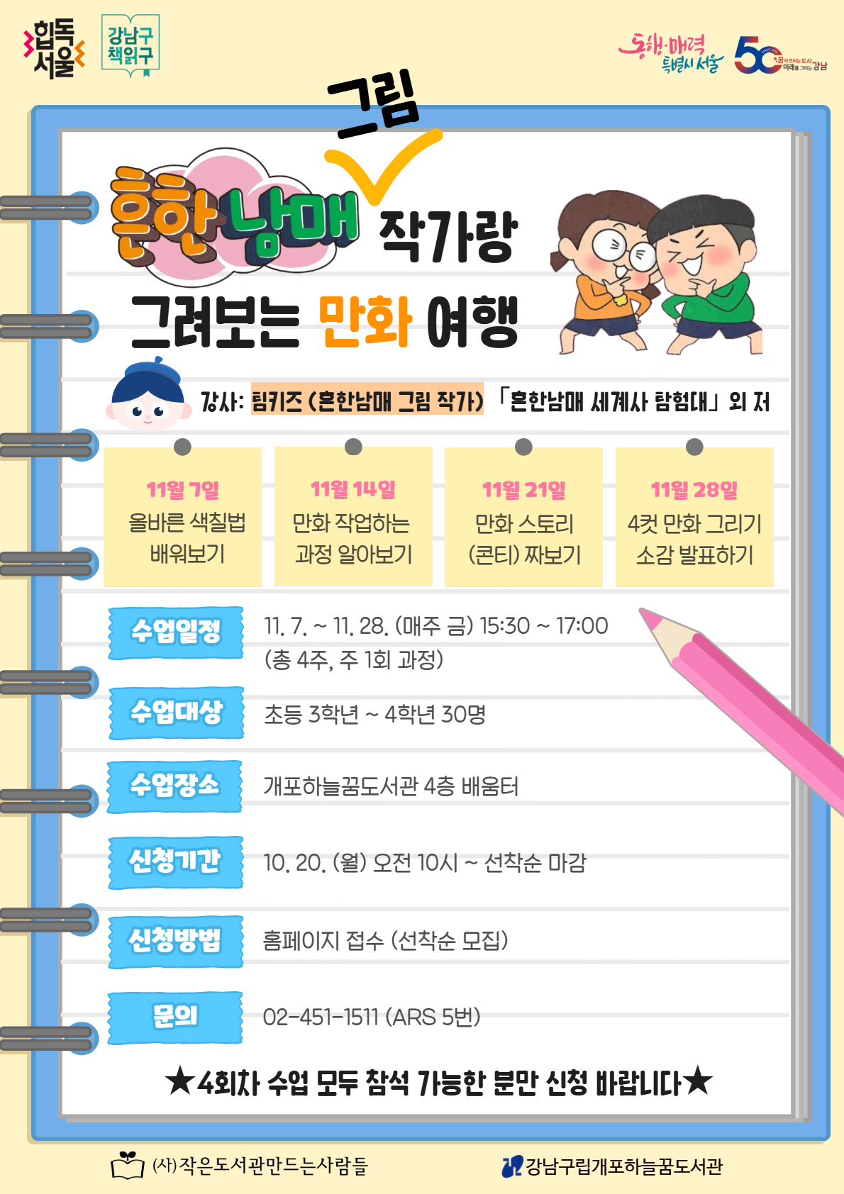 「흔한남매 세계사 탐험대」,「파뿌리 뽑기 투어」 좋아하는 개포하늘꿈 어린이 여기 모여라~! 흔한남매 그림 작가님과 떠나는 만화 여행 ♪♬ 나만의 만화 스토리를 완성해보는 특별한 시간을 가져봐요. 11월 매주 금요일 오후 3시 30분에 개포하늘꿈도서관에서 만나요~ ₍ ᐢ·ᴥ·ᐢ ₎ ʚ₍ ᐢ. ̫ .ᐢ ₎ɞ ★ 프로그램 유의사항 ★ 1) 본 프로그램은 총 4회차 연속 수업으로 진행됩니다. 2) 전 회차 참여 가능한 분만 신청 부탁드립니다. 3) 일부 회차만 참여는 불가능하며, 불참 시 신청이 취소됩니다. ![]() ![]() ※프로그램 신청시 참여자 본인의 아이디로 신청 하셔야 합니다. ※프로그램 신청 시 홍보용 사진 촬영 및 사용에 동의하시는 것으로 간주됩니다. ※프로그램 관련 공지사항은 문자로 발송되오니 회원가입 시 입력된 휴대폰번호 확인 부탁드립니다. ○ 일시 : 2025. 11. 7. - 11. 28. 금요일 15:30~17:00 (총 4회차) ○ 대상 : 초등 3 ~ 4학년 30명 ○ 장소 : 개포하늘꿈도서관 4층 배움터 ○ 신청방법 : 개포하늘꿈도서관 홈페이지 ○ 문의 : 02-451-1511 / ARS 5번 |
