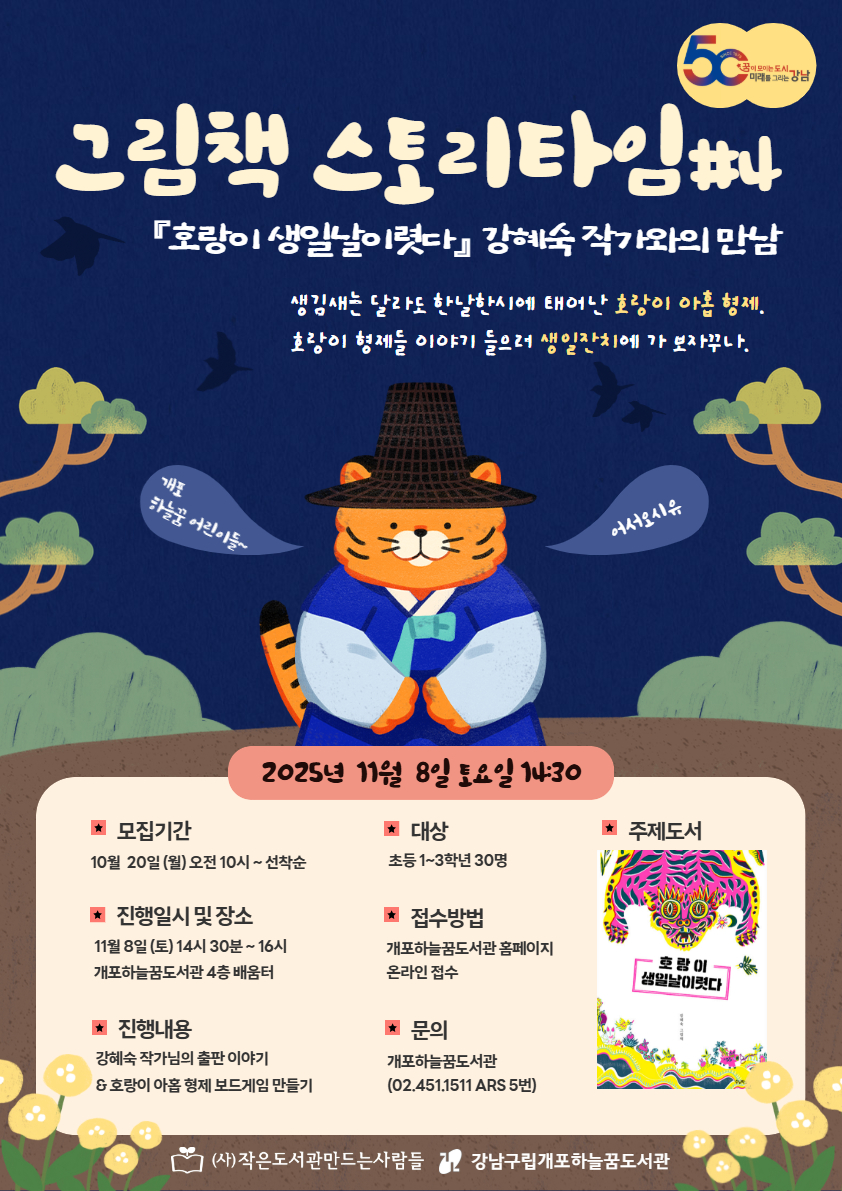 | 행사명 | 개포하늘꿈 [배움] 2025 그림책 스토리타임 #4 「호랑이 생일날이렷다」 강혜숙 작가와의 만남 |