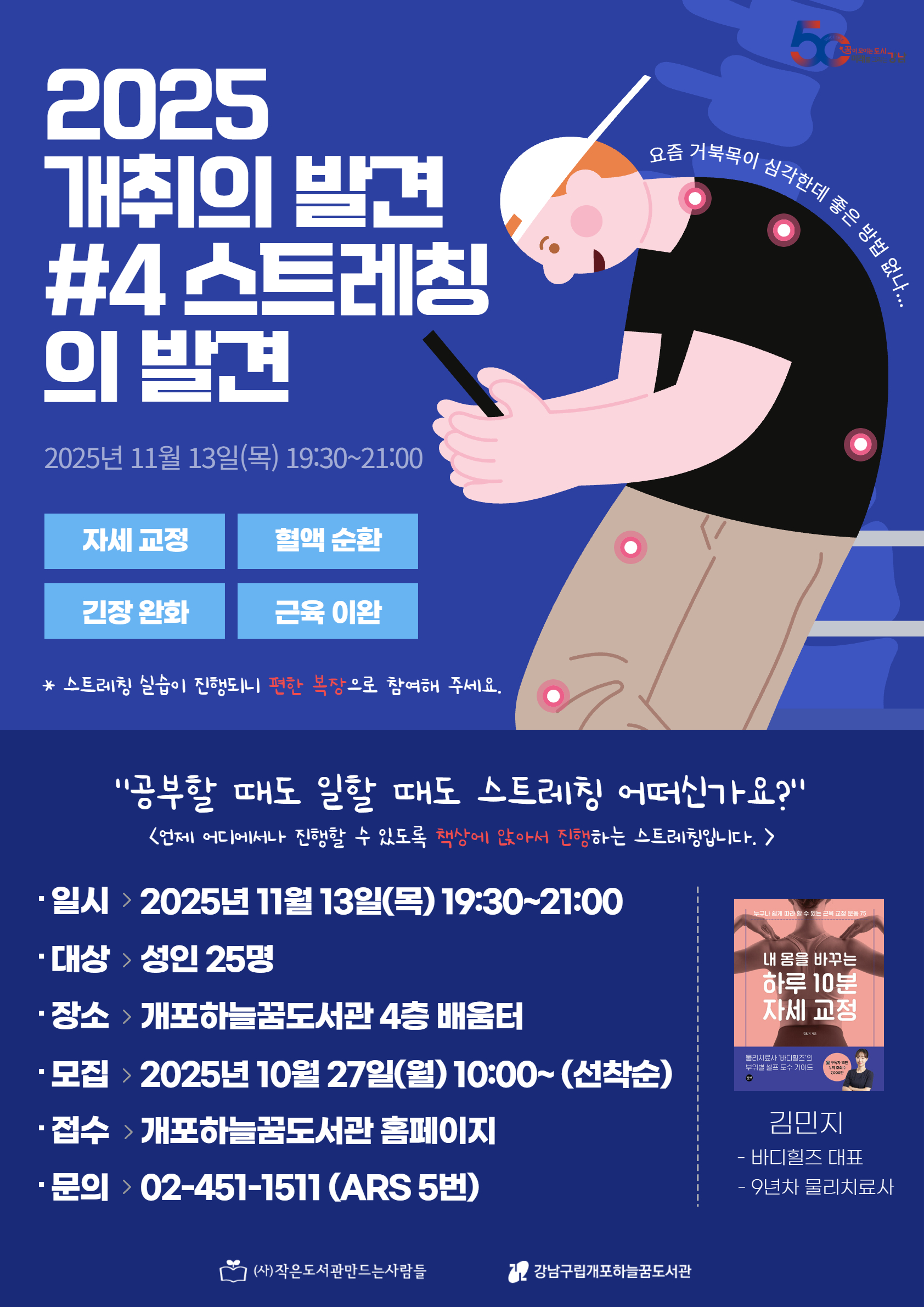 개취의 발견이란? 개포하늘꿈도서관에서 취미의 발견 일이나 과제로 하루 종일 컴퓨터를 보고, 쉬는 시간에는 스마트폰을 보는 현대인에게 '피로'는 피할 수 없는 일처럼 느껴집니다. 그럼에도 피곤한 몸을 풀고 싶지만 운동을 하기에는 시간이 부족하고, 방법도 모르겠는 사람들을 모집합니다. 일을 하면서, 공부를 하면서도 진행할 수 있도록 책상에 앉아서 진행하는 다양한 스트레칭 방법을 알려드립니다 ※ 스트레칭 실습이 포함되어 있으니 편한 복장으로 참여해주세요. ![]() ![]() ○일시 : 2025. 11. 13.(목요일) 19:30~21:00 ○대상 : 성인 25명 ○장소 : 하늘꿈도서관 4층 배움터 ○접수 : 2025년 10월 27일(월) 오전 10시 ~ (선착순) ○신청방법 : 개포하늘꿈도서관 홈페이지 ○문의 : 02-451-1511 / ARS 5번 ※프로그램 신청시 참여자 본인의 아이디로 신청 하셔야 합니다. ※프로그램 신청 시 홍보용 사진 촬영 및 사용에 동의하시는 것으로 간주됩니다. ※프로그램 관련 공지사항은 문자로 발송되오니 회원가입 시 입력된 휴대폰번호 확인 부탁드립니다. |