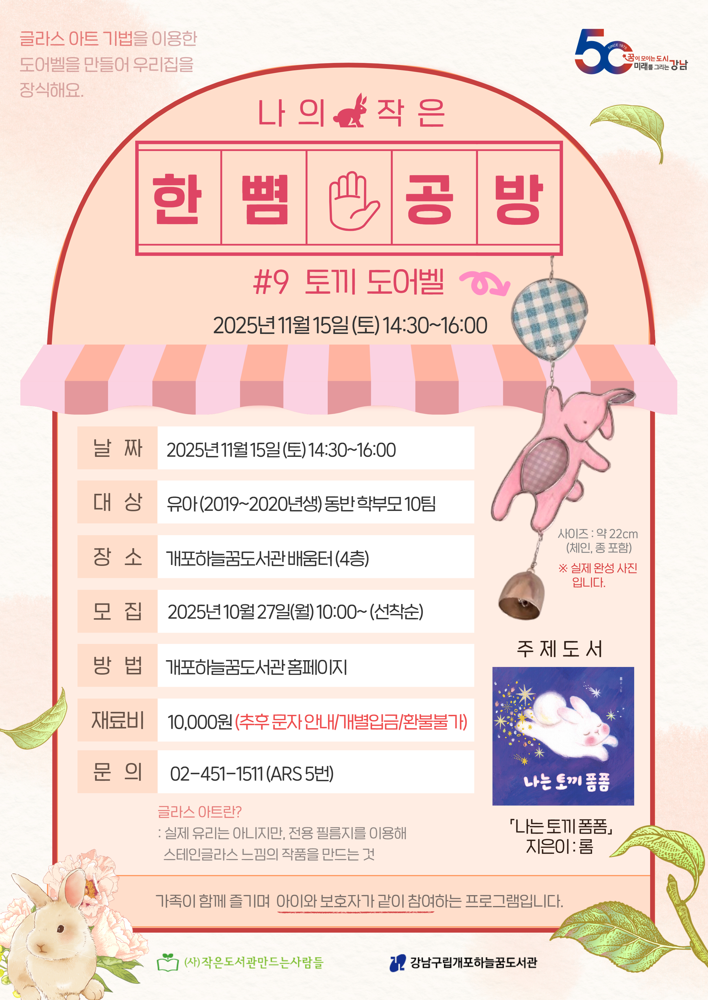 ★유아(2019~2020년생)와 보호자가 동반하는 프로그램입니다★ ★프로그램 신청 시 자녀 분의 ID로 신청할 수 있습니다★ 개포하늘꿈도서관에서 <나의 작은 한뼘 공방 #9 토끼 도어벨>를 진행합니다. <나는 토끼 폼폼>을 함께 읽고, 우리 집에서 직접 사용할 수 있는 토끼 도어벨을 제작합니다. 글라스 아트 방식으로 제작됩니다. 글라스 아트란? 실제 유리가 아니라서 안전하고 제작하기도 더 쉽지만, 스테인글라스 (유리 공예) 느낌의 작품을 제작하는 것 신청이 완료되면, 재료비(10,000원)를 기한 내에 입금해야 참가할 수 있습니다. - 신청 마감 후 개별 문자로 안내 - 기한 내 미 입금시 신청 취소 (대기자 참가) - 입금 후 환불 불가능 ![]() ![]() ○일시 : 2025. 11. 15.(토요일) 14:30~16:00 ○대상 : 유아(2019~2020년생) 동반 학부모 10팀 ○장소 : 하늘꿈도서관 4층 배움터 ○접수 : 2025년 10월 27일(월) 오전 10시 ~ (선착순) ○신청방법 : 하늘꿈도서관 홈페이지 ○문의 : 02-451-1511 / ARS 5번 ※프로그램 신청시 참여자 본인의 아이디로 신청 하셔야 합니다. ※프로그램 신청 시 홍보용 사진 촬영 및 사용에 동의하시는 것으로 간주됩니다. ※프로그램 관련 공지사항은 문자로 발송되오니 회원가입 시 입력된 휴대폰번호 확인 부탁드립니다. |
