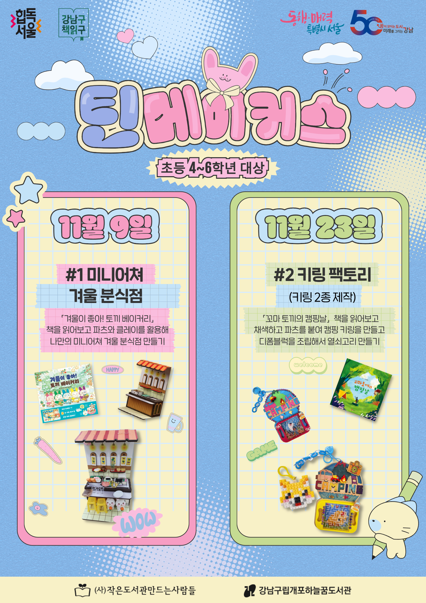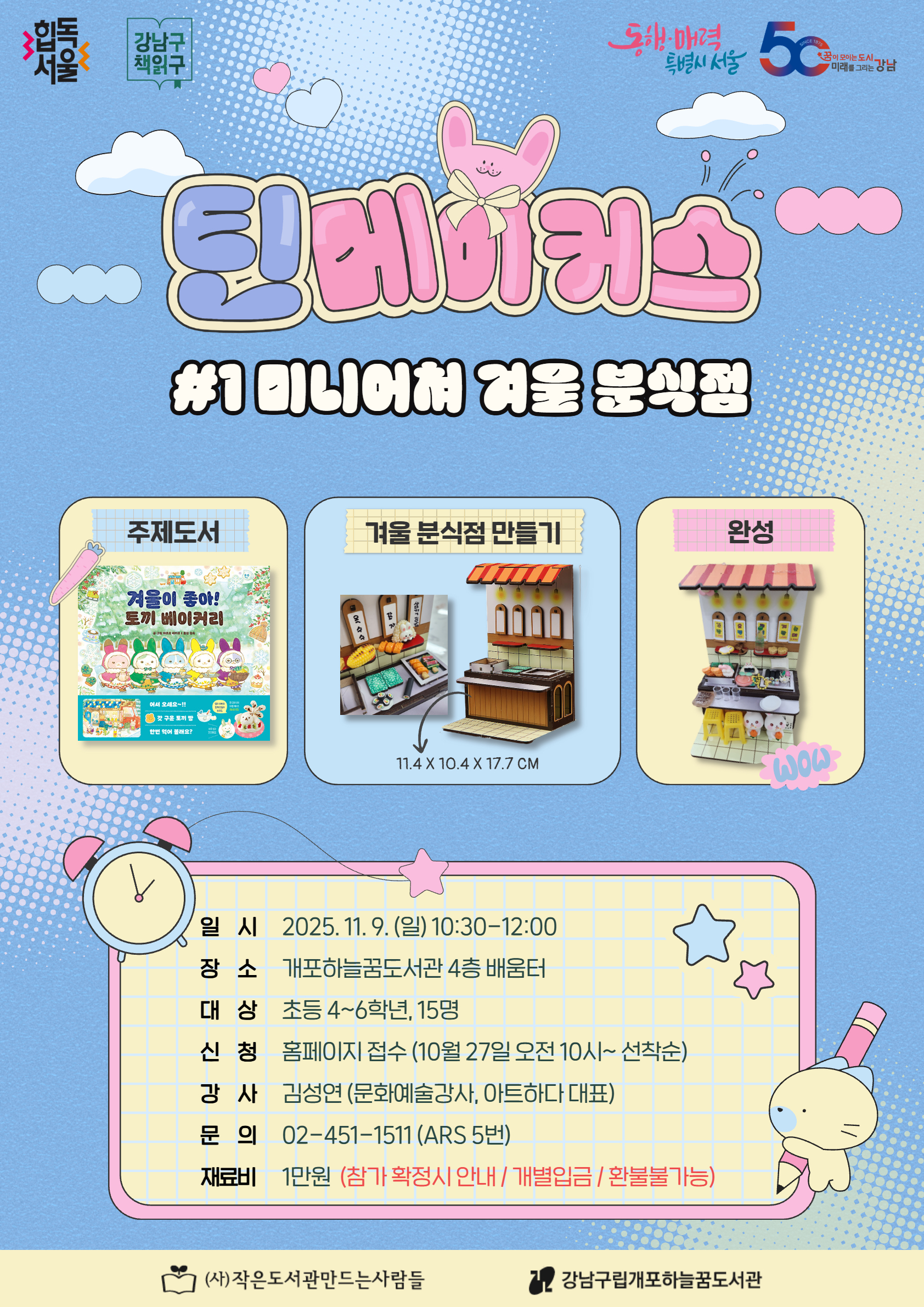 초등 4~6학년을 대상으로 하는 만들기 체험 프로그램입니다. 첫 번째 시간에는 <겨울이 좋아! 토끼 베이커리> 책을 함께 읽고, 다양한 파츠와 클레이를 활용해 나만의 미니어처 겨울 분식점을 만들어 봅니다. ※ 안내사항 ※ 본 프로그램은 신청 완료 후 재료비 10,000원을 입금해야 참여가 확정됩니다. (프로그램 일주일 전 개별 문자로 입금 안내를 드릴 예정이니, 기한 내 입금을 꼭 부탁드립니다.) ![]() ![]() ![]() ○일시 : 2025. 11. 9. 일요일 10:30~12:00 ○대상 : 초등 4~6학년 15명 ○장소 : 개포하늘꿈도서관 4층 배움터 ○신청방법 : 개포하늘꿈도서관 홈페이지 ○문의 : 02-451-1511 / ARS 5번 ※프로그램 신청시 참여자 본인의 아이디로 신청 하셔야 합니다. ※프로그램 신청 시 홍보용 사진 촬영 및 사용에 동의하시는 것으로 간주됩니다. ※프로그램 관련 공지사항은 문자로 발송되오니 회원가입 시 입력된 휴대폰번호 확인 부탁드립니다. |