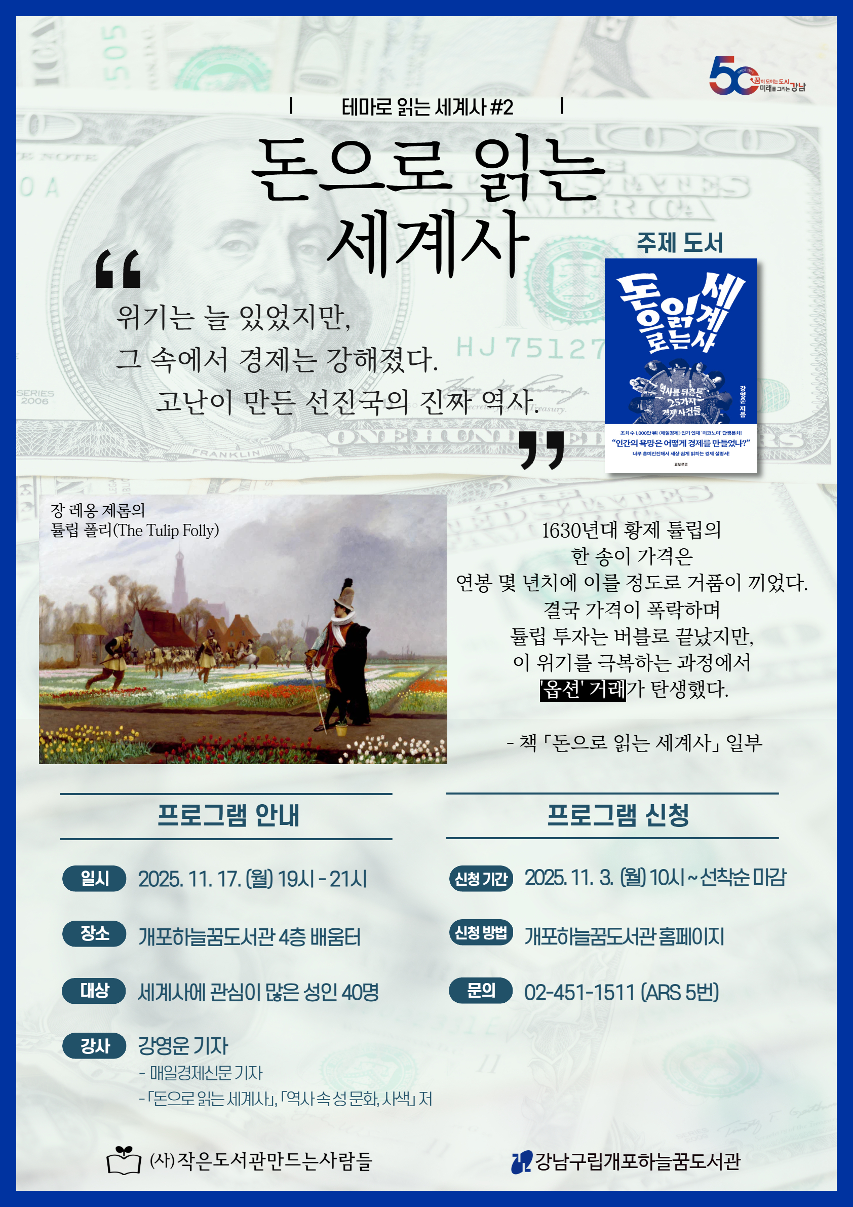 | 행사명 | 개포하늘꿈 [배움] 테마로 읽는 세계사 #2 돈으로 읽는 세계사 |