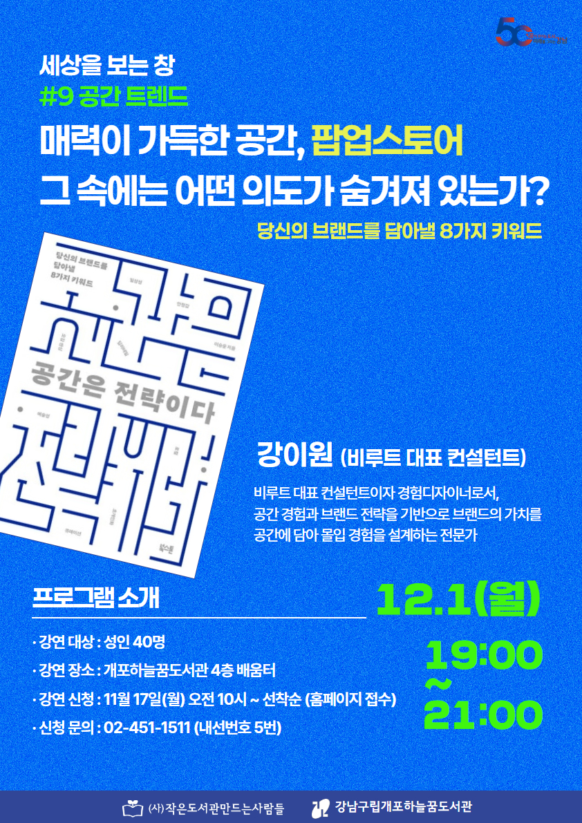 <세상을 보는 창 #9 공간 트렌드> 2025년, 지금은 그야말로 ‘팝업의 전성시대’입니다. 도심 곳곳에서 수많은 팝업 스토어가 열리고 있죠. 과거에는 패션과 뷰티 중심의 팝업이 주를 이뤘다면, 이제는 테크, 식품, 라이프스타일은 물론 의약품과 가상자산까지 산업의 경계를 허문 이색 팝업들이 등장하고 있습니다. 그렇다면, 우리는 왜 이렇게 팝업에 열광하게 되었을까요? 이번 〈세상을 보는 창 #9 공간 트렌드〉에서는 경험 디자이너이자 비루트 대표 컨설턴트인 강이원 이사님과 함께 인기 팝업 스토어의 공간 구성 원리와 그 속에 숨겨진 브랜드의 전략적 의도를 살펴보고자 합니다. 공간과 경험 디자인에 관심이 많으신 분, 또는 요즘 뜨는 팝업 스토어를 자주 찾는 분들에게 유익한 내용을 다루고 있으니 많은 참여 바랍니다. ![]() ![]() ○일시 : 2025. 12. 1.(월요일) 19:00~21:00 ○대상 : 성인 40명 ○장소 : 하늘꿈도서관 4층 배움터 ○접수 : 2025년 11월 17일(월) 오전 10시 ~ (선착순) ○신청방법 : 개포하늘꿈도서관 홈페이지 ○문의 : 02-451-1511 / ARS 5번 ※프로그램 신청시 참여자 본인의 아이디로 신청 하셔야 합니다. ※프로그램 신청 시 홍보용 사진 촬영 및 사용에 동의하시는 것으로 간주됩니다. ※프로그램 관련 공지사항은 문자로 발송되오니 회원가입 시 입력된 휴대폰번호 확인 부탁드립니다. |
