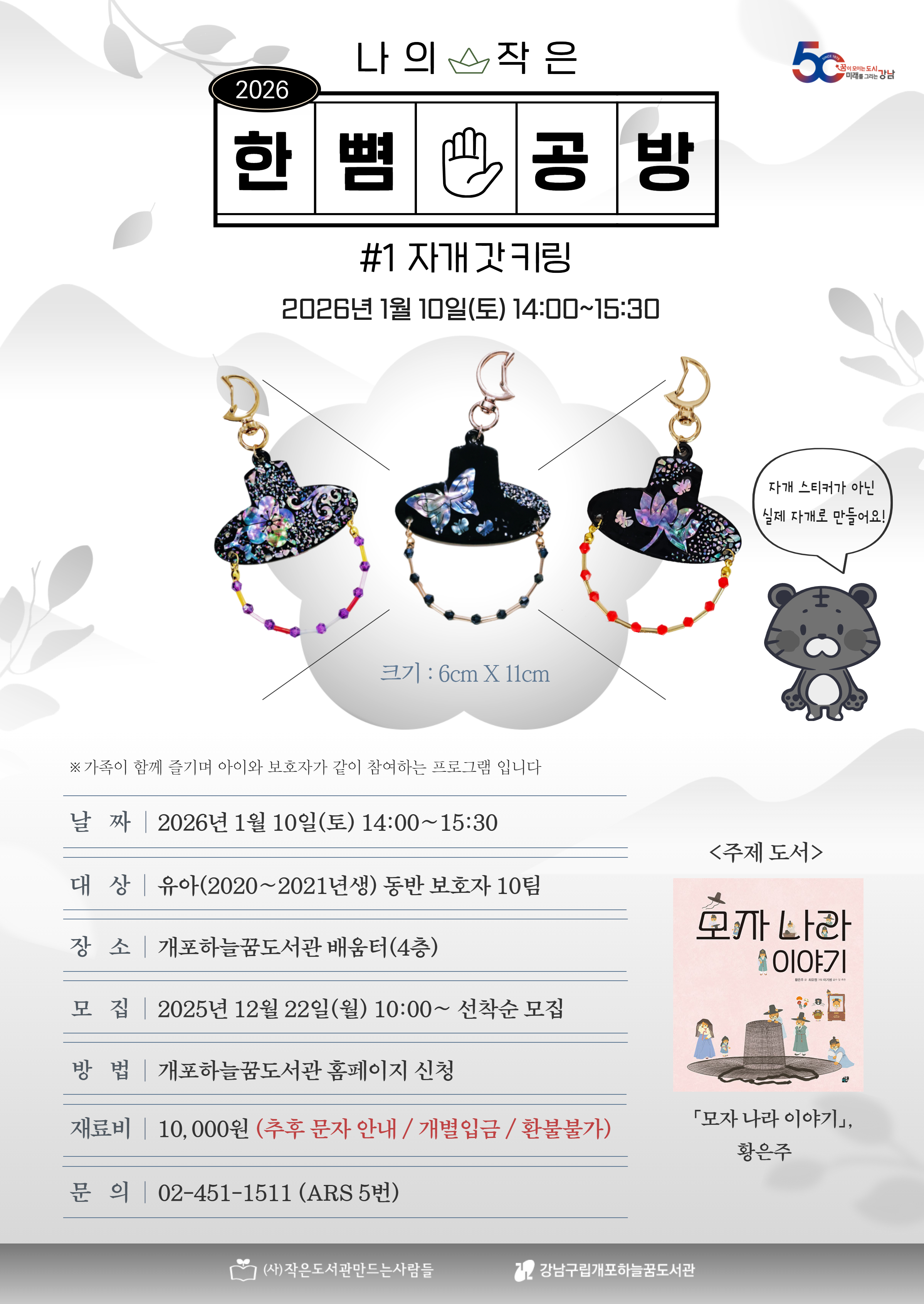 ★유아(2020~2021년생)와 보호자가 동반하는 프로그램입니다★ ★프로그램 신청 시 자녀 분의 ID로 신청할 수 있습니다★ 2025년에 진행되었던 한뼘공방이 2026년에도 진행됩니다. 첫 프로그램으로는 <나의 작은 한뼘 공방 #1 자개 갓 키링>을 진행합니다. <모자 나라 이야기>을 함께 읽고, 실제로 달고 다닐 수 있는 키링을 제작합니다. 자개 스티커가 아닌 실제 자개를 이용하여 나만의 디자인으로 작품을 완성할 수 있습니다. 신청이 완료되면, 재료비(10,000원)를 기한 내에 입금해야 참가할 수 있습니다. - 신청 마감 후 개별 문자로 안내 - 기한 내 미 입금시 신청 취소 (대기자 참가) - 입금 후 환불 불가능 ![]() ![]() ○일시 : 2026. 1. 10.(토요일) 14:00~15:30 ○대상 : 유아(2020~2021년생) 동반 학부모 10팀 ○장소 : 하늘꿈도서관 4층 배움터 ○접수 : 2025년 12월 22일(월) 오전 10시 ~ (선착순) ○신청방법 : 하늘꿈도서관 홈페이지 ○문의 : 02-451-1511 / ARS 5번 ※프로그램 신청시 참여자 본인의 아이디로 신청 하셔야 합니다. ※프로그램 신청 시 홍보용 사진 촬영 및 사용에 동의하시는 것으로 간주됩니다. ※프로그램 관련 공지사항은 문자로 발송되오니 회원가입 시 입력된 휴대폰번호 확인 부탁드립니다. |