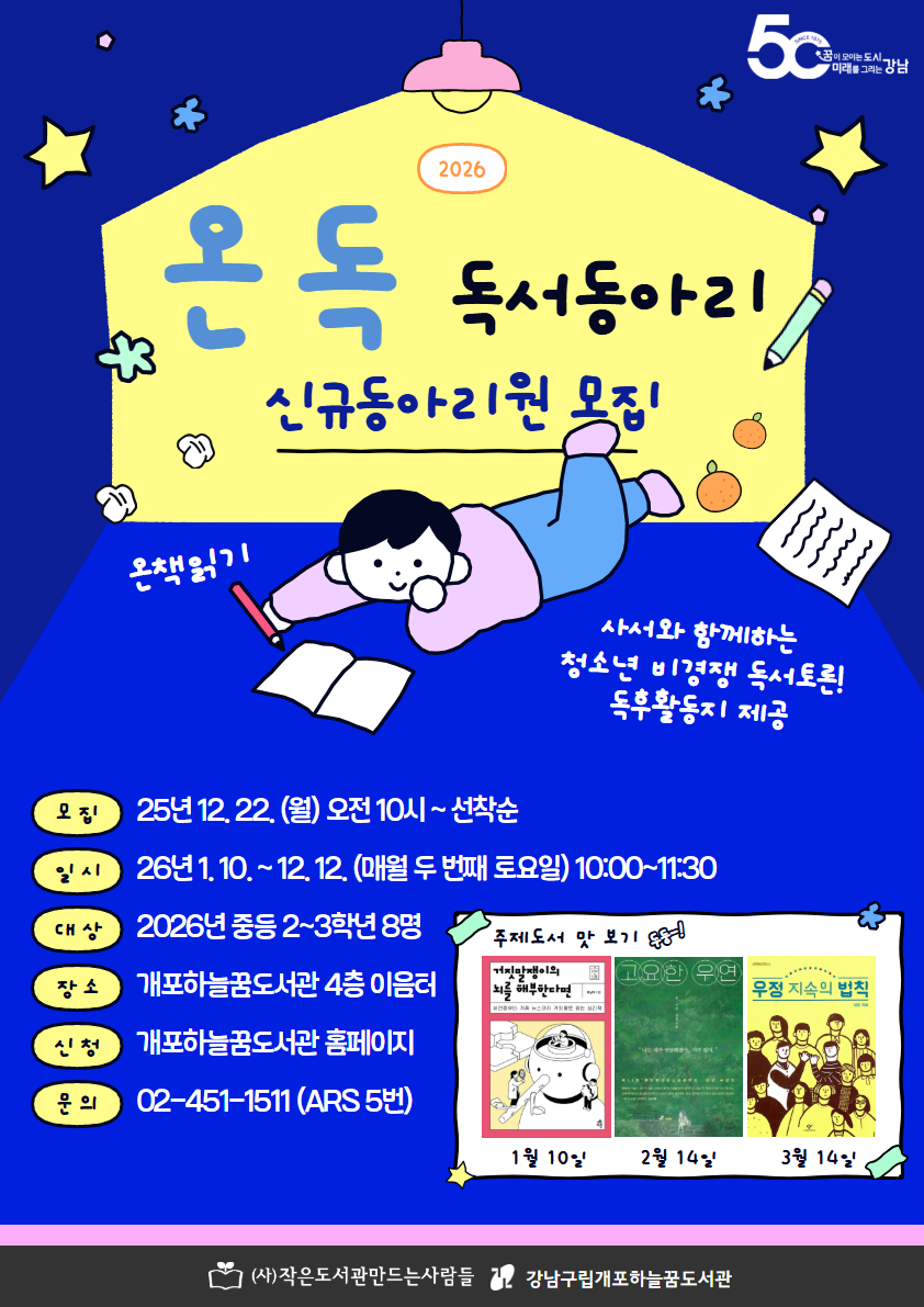 "온 책 읽 기" 독서동아리 : 책을 혼자 읽고 다른 사람의 생각은 어떤지 교류하며 책 전체를 읽는 걸 '온책읽기'라고 합니다. 개포하늘꿈도서관에서 2026년 중2~중3 학년 친구들과 함께 재미있게 책 읽고 비경쟁 토론을 할 신규 회원을 모집합니다. 사서 선생님과 함께 다양한 주제의 도서를 읽고 함께 생각을 공유하고 독서실행 습관을 길러보아요! ![]() ![]() ※ 동아리 신청시 참여자 본인의 아이디로 신청 하셔야 합니다. ※ 동아리 신청 시 홍보용 사진 촬영 및 사용에 동의하시는 것으로 간주됩니다. ※ 동아리 관련 공지사항은 문자 또는 전체 오픈 카카오톡으로 발송되오니 회원가입 시 입력된 휴대폰번호 확인 부탁드립니다. ○일시 : 2026. 1. 10. ~ 2026. 12. 12. (월1회, 매월 두 번째 토요일) 10:00~11:30 ○대상 : 2026년 기준 중등 2~3학년, 8명 ○장소 : 개포하늘꿈도서관 4층 이음터 ○신청방법 : 개포하늘꿈도서관 홈페이지 ○문의 : 02-451-1511 |