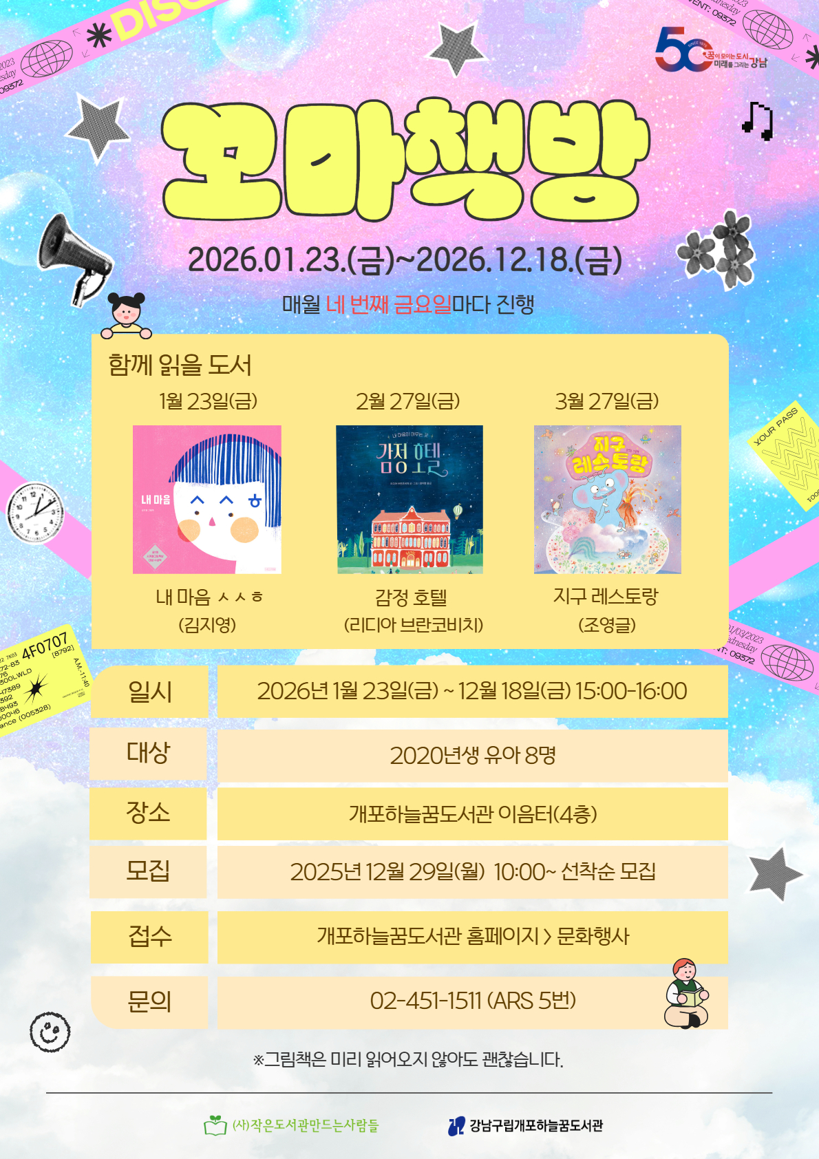⭐2020년생 친구들을 모집합니다⭐ 개포하늘꿈도서관의 유아 독서동아리인 <꼬마책방>에서는 매월 네 번째 금요일 15시마다 친구들과 함께 그림책을 읽고, 같이 즐거운 활동을 진행합니다! 1월 23일(금) 내 마음 ㅅㅅㅎ(김지영) - 첫 만남 2월 27일(금) 감정 호텔(리디아 브란코비치) 3월 27일(금) 지구 레스토랑(조영글) ※ 책은 동아리 시간에 다 같이 읽으므로 미리 안 읽어와도 괜찮습니다 ![]() ![]() ○ 일시 : 2025년 1월 23일(금) ~ 12월 18일(금) 15:00 ~ 16:00 (총 12회) ○ 장소 : 개포하늘꿈도서관 4층 이음터 ○ 대상 : 유아 8명(2020년생) ○ 접수 : 2025년 12월 29일 (월) 오전 10시 ~ (선착순) ○ 신청방법 : 개포하늘꿈도서관 홈페이지 온라인 접수 ○ 문의 : 02-451-1511 / ARS 5번 ※ 프로그램 신청시 참여자 본인의 아이디로 신청 하셔야 합니다. ※ 프로그램 신청 시 홍보용 사진 촬영 및 사용에 동의하시는 것으로 간주됩니다. ※ 프로그램 관련 공지사항은 문자로 발송되오니 회원가입 시 입력된 휴대폰번호 확인 부탁드립니다. |