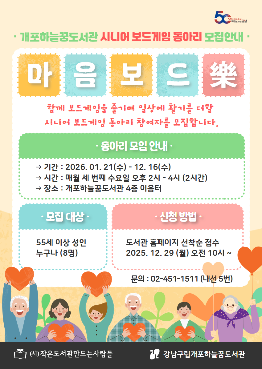 <마음보드락(樂)>은 보드게임이라는 매개체를 통해 정기적으로 만나 소통하고 협력하며, 긍정적인 정서를 나누는 시니어 보드게임 동아리입니다. 새롭고 즐거운 여가 문화를 경험하실 분들의 관심을 바랍니다. ★ <마음보드락(樂)>은 55세 이상 성인(1972년 이후 출생)에 한해 참여할 수 있습니다. ★ 동아리 모임은 매월 세번째 수요일 오후 2시~4시, 개포하늘꿈도서관 4층 이음터에서 진행됩니다. ★ 매월 꾸준히 참여하실 분들의 참여를 기다립니다. ※ 1월 모임(1/21)은 오리엔테이션으로, 서로 인사를 나누고 차시별 리더를 선정하는 시간을 갖습니다. ※ 차시별 리더 2인을 선정하며, 리더는 담당하는 게임의 방법 규칙을 설명하고 게임을 진행합니다. ※ 보드게임은 개포하늘꿈도서관에서 소장 중인 게임 중 선정합니다. ![]() ![]() ※ 동아리 신청시 참여자 본인의 아이디로 신청하셔야 합니다. ※ 동아리 신청시 홍보용 사진 촬영 및 사용에 동의하시는 것으로 간주합니다. ※ 동아리 관련 공지사항은 문자 또는 카카오톡으로 발송됩니다. 회원가입 시 입력된 휴대전화번호를 확인해주세요. ○ 운영 기간 : 2026. 1. 21. ~ 12. 16. (매월 세 번째 수요일) 14:00~16:00 ○ 장소 : 개포하늘꿈도서관 4층 이음터 ○ 대상 : 55세 이상 성인 8명 ○ 신청 방법 : 개포하늘꿈도서관 홈페이지 신청 ○ 문의 : 02-451-1511 |