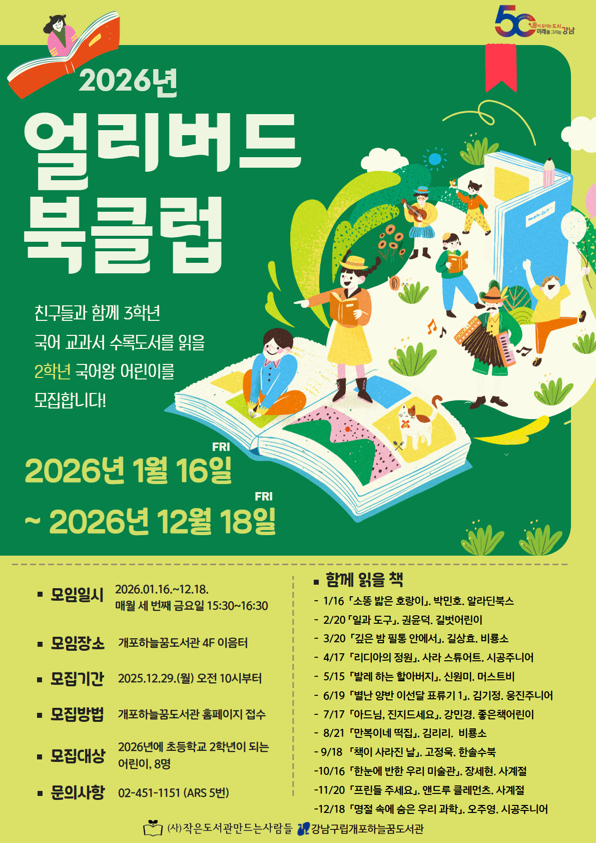 ★ <얼리버드 북클럽>은 2025년 기준 초등 1학년 어린이가 신청할 수 있습니다. ★ 친구들과 함께 3학년 국어 교과서 수록 도서를 읽을 2026년 초등 2학년이 된 어린이를 모집합니다. 혼자서 책 읽기가 어려웠던 어린이! 선생님과 친구들과 함께 읽어 더욱 즐겁고 신나는 우리 동아리에서 만나요~ ★ 보호자께서는 어린이가 해당 월의 주제 도서를 읽고 참여할 수 있도록 독려해 주시기 바랍니다. ![]() ![]() ※프로그램 신청시 참여자 본인의 아이디로 신청 하셔야 합니다. ※프로그램 신청 시 홍보용 사진 촬영 및 사용에 동의하시는 것으로 간주됩니다. ※프로그램 관련 공지사항은 문자로 발송되오니 회원가입 시 입력된 휴대폰번호 확인 부탁드립니다. ○일 시 : 2026. 1. 16. ~ 12. 18. 매월 세 번째 금요일 15:30~16:30 ○대 상 : 2026년에 초등학교 2학년이 되는 어린이 ○장 소 : 개포하늘꿈도서관 4층 이음터 ○신 청 방 법 : 개포하늘꿈도서관 홈페이지 ○문 의 : 02-451-1511 |
