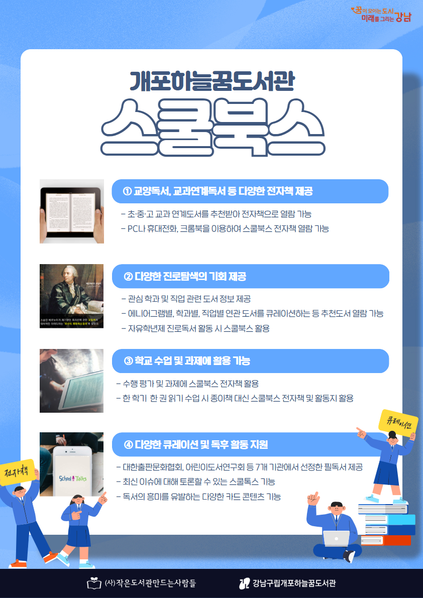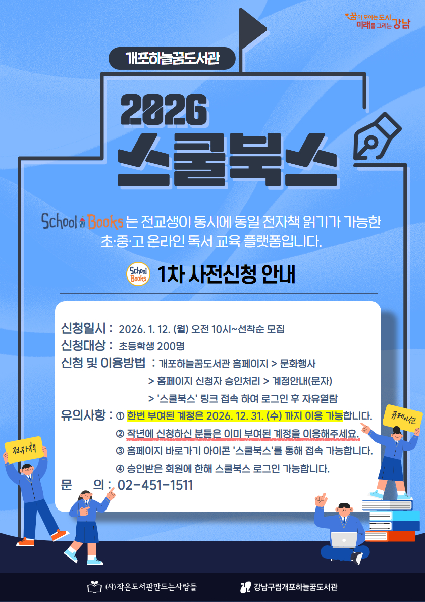 개포하늘꿈도서관에서 <2026년 스쿨북스> 사전신청자를 모집합니다. 스쿨북스란? 초·중·고 대상 추천도서를 큐레이션 받아볼 수 있는 전자책 서비스로 대표적인 온라인 독서 교육 플랫폼입니다. 개포하늘꿈도서관 스쿨북스에서는 2만여종의 추천도서 큐레이션과 2천여권의 전자책을 열람할 수 있습니다. 스쿨북스를 이용하면, ① 교양독서, 교과연계독서 등 다양한 전자책 제공 ② 다양한 진로탐색의 기회 제공 ③ 학교 수업 및 과제에 활용 가능 ④ 다양한 큐레이션 및 독후 활동 지원 등 전자책을 활용한 다양한 서비스를 제공받을 수 있습니다. *작년에 신청하신 분들은 이미 부여된 계정을 이용해주세요. *승인받은 회원에 한해서만 스쿨북스 로그인이 가능하므로 사전신청자를 받고 있습니다. *승인 처리 후 계정을 문자로 안내드릴 예정이며, 부여된 계정으로 로그인하여 서비스를 이용하실 수 있습니다. ● 신청일시 : 2026. 1. 12. (월) 오전 10시~선착순 모집 ● 신청대상 : 초등학생 1~6학년 200명 ● 문 의 : 02-451-1511 ![]()
